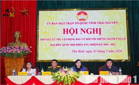 Ngày 3-3, tại Hội trường UBND xã Phú Bình và Nhà hát phường Vạn Xuân, Ủy ban MTTQ Việt Nam tỉnh Thái Nguyên tổ chức hội nghị tiếp xúc cử tri, vận động bầu cử đối với các ứng viên đại biểu Quốc hội khoá XVI tại đơn vị bầu cử số 2 tỉnh Thái Nguyên. Hội nghị kết nối trực tuyến với cử tri tại các điểm cầu xã Điềm Thuỵ, Tân Thành, Kha Sơn, Tân Khánh, Phổ Yên, Phúc Thuận, Vạn Xuân, Trung Thành, Sông Công, Bá Xuyên và Bách Quang.
