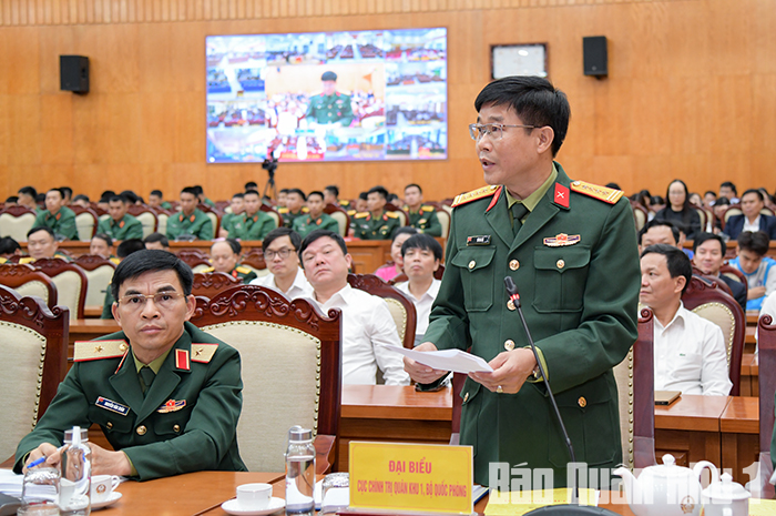 Đại tá Vũ Bá Bộ, Phó Chủ nhiệm Chính trị Quân khu đại diện cử tri phát biểu ý kiến tại hội nghị.