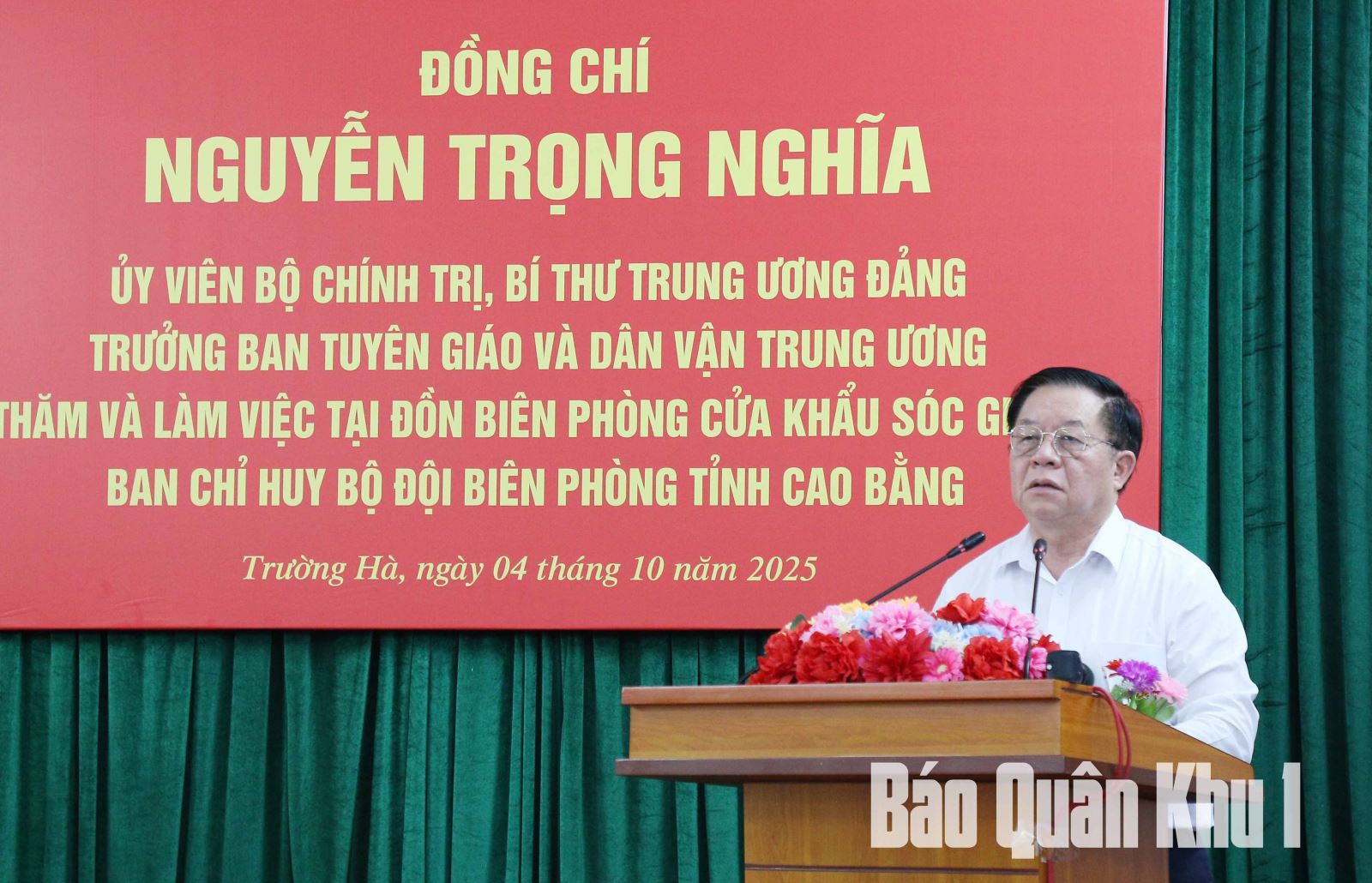 Đồng chí Nguyễn Trọng Nghĩa yêu cầu BĐBP tỉnh Cao Bằng cần tiếp tục quán triệt sâu sắc quan điểm của Đảng về nhiệm vụ quốc phòng, an ninh, bảo vệ vững chắc chủ quyền lãnh thổ, an ninh biên giới quốc gia; giữ vững phương châm “Đồn là nhà, biên giới là quê hương, đồng bào các dân tộc là anh em ruột thịt”; phối hợp chặt chẽ với cấp ủy, chính quyền, các ban, ngành, đoàn thể và nhân dân trên địa bàn, xây dựng thế trận biên phòng toàn dân gắn với thế trận quốc phòng toàn dân và thế trận an ninh nhân dân vững chắc.