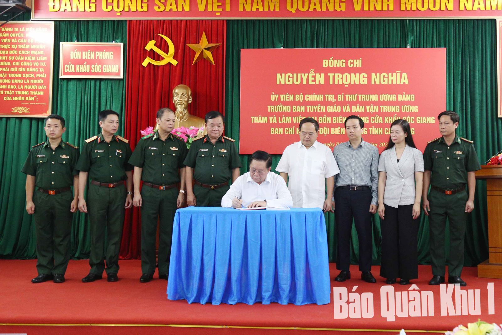 Đồng chí Trưởng ban Tuyên giáo và Dân vận Trung ương Nguyễn Trọng Nghĩa ghi cảm tưởng sổ vàng truyền thống của Đồn Biên phòng Cửa khẩu Sóc Giang.