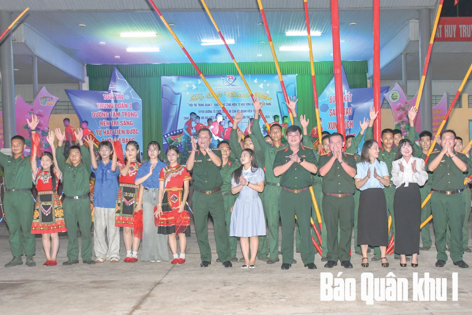Đại tá Nông Tiến Dũng, Phó Chủ nhiệm Chính trị Quân khu và chỉ huy Sư đoàn 3 giao lưu văn nghệ cùng cán bộ, đoàn viên thanh niên Trung đoàn 2 và lực lượng kết nghĩa của đơn vị. Ảnh: KIỀU OANH