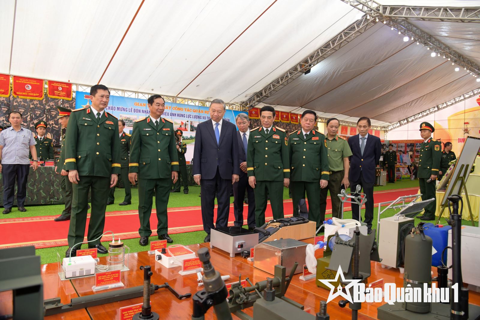 Tổng Bí thư, Chủ tịch nước Tô Lâm cùng các đại biểu tham quan gian trưng bày của LLVT Quân khu 1.