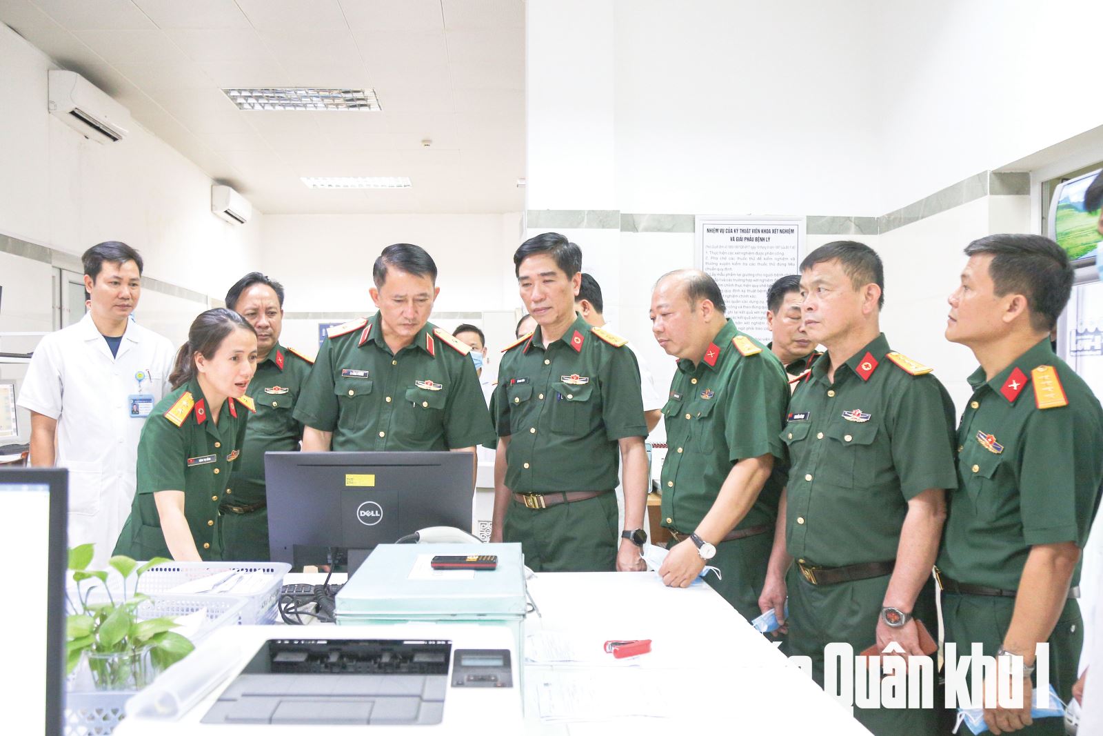 Thiếu tướng La Công Phương, Bí thư Đảng ủy, Chính ủy Quân khu kiểm tra thực hiện chuyển đổi số tại Bệnh viện Quân y 110. Ảnh: HẢI BIÊN