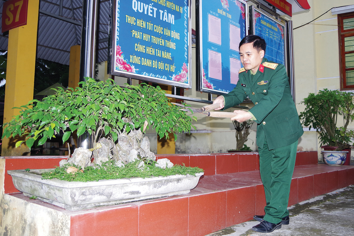 Đại úy Vương Văn Lự cắt tỉa cây cảnh làm đẹp đơn vị.