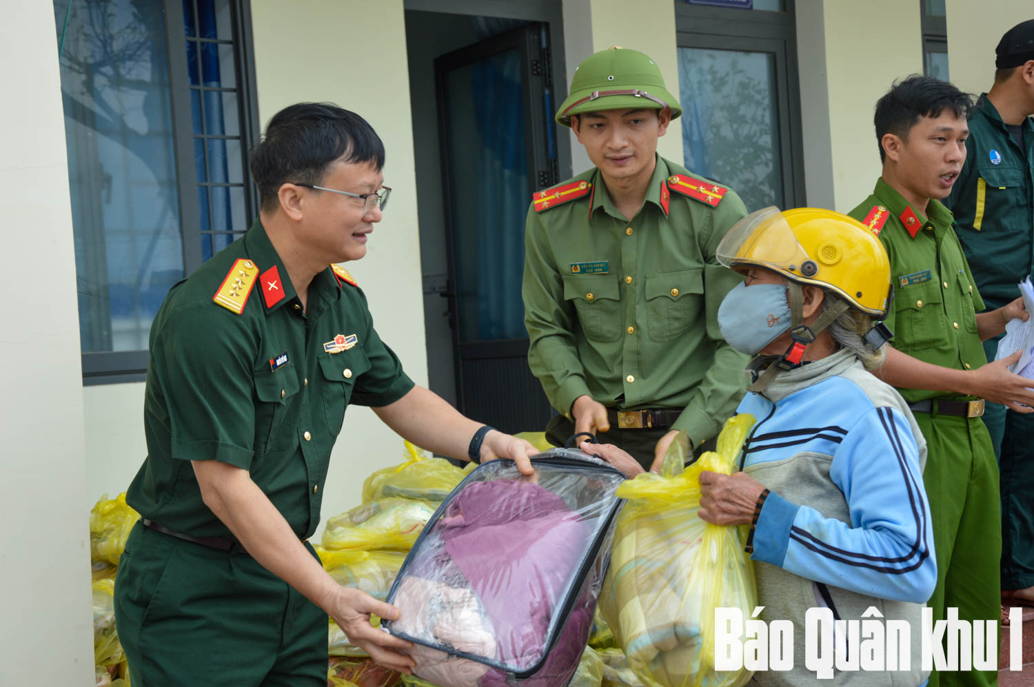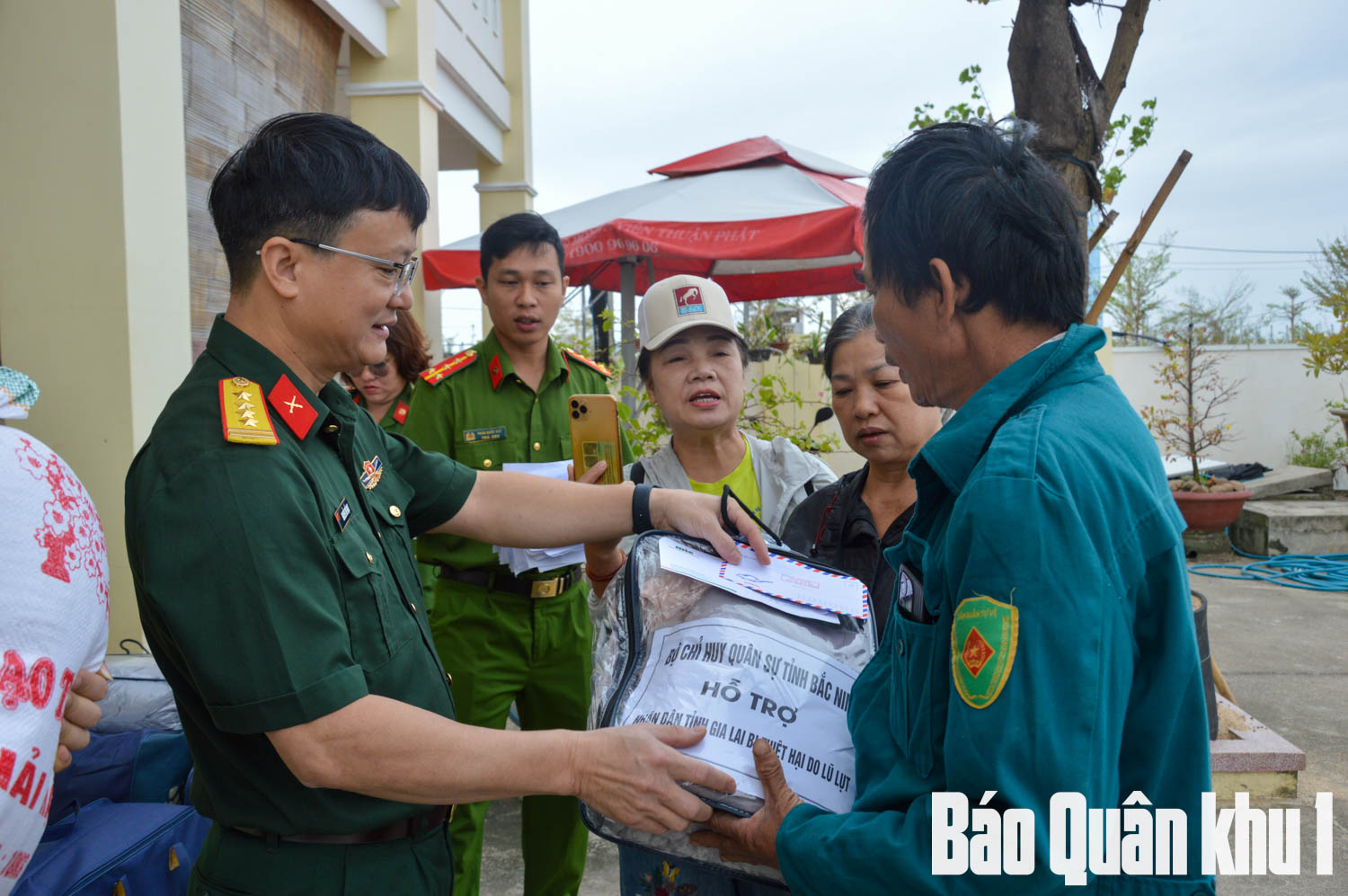 Tại đây, đoàn cũng trực tiếp trao 400 suất quà hỗ trợ bà con nhân dân xã Tuy Phước Bắc, gồm: lương thực, nhu yếu phẩm thiết yếu (6,5 tấn gạo, gần 200 thùng mì tôm; hơn 1.000 bộ chăn ấm, quần áo, màn tuyn) thuốc men và các vật dụng sinh hoạt cho bà con, sách vở, cặp sách, đồ dùng học tập cho các cháu học sinh tại những địa bàn chịu thiệt hại nặng; riêng các hộ gia đình bị sập nhà hoàn toàn, đoàn công tác hỗ trợ thêm các suất quà bằng tiền mặt. Tổng giá trị trên hơn 300 triệu đồng; số tiền được Bộ CHQS tỉnh Bắc Ninh phối hợp với các cơ quan chức năng, hội thiện nguyện Tâm Từ Bi-Thị, Đáp Cầu (tỉnh Bắc Ninh) ủng hộ.