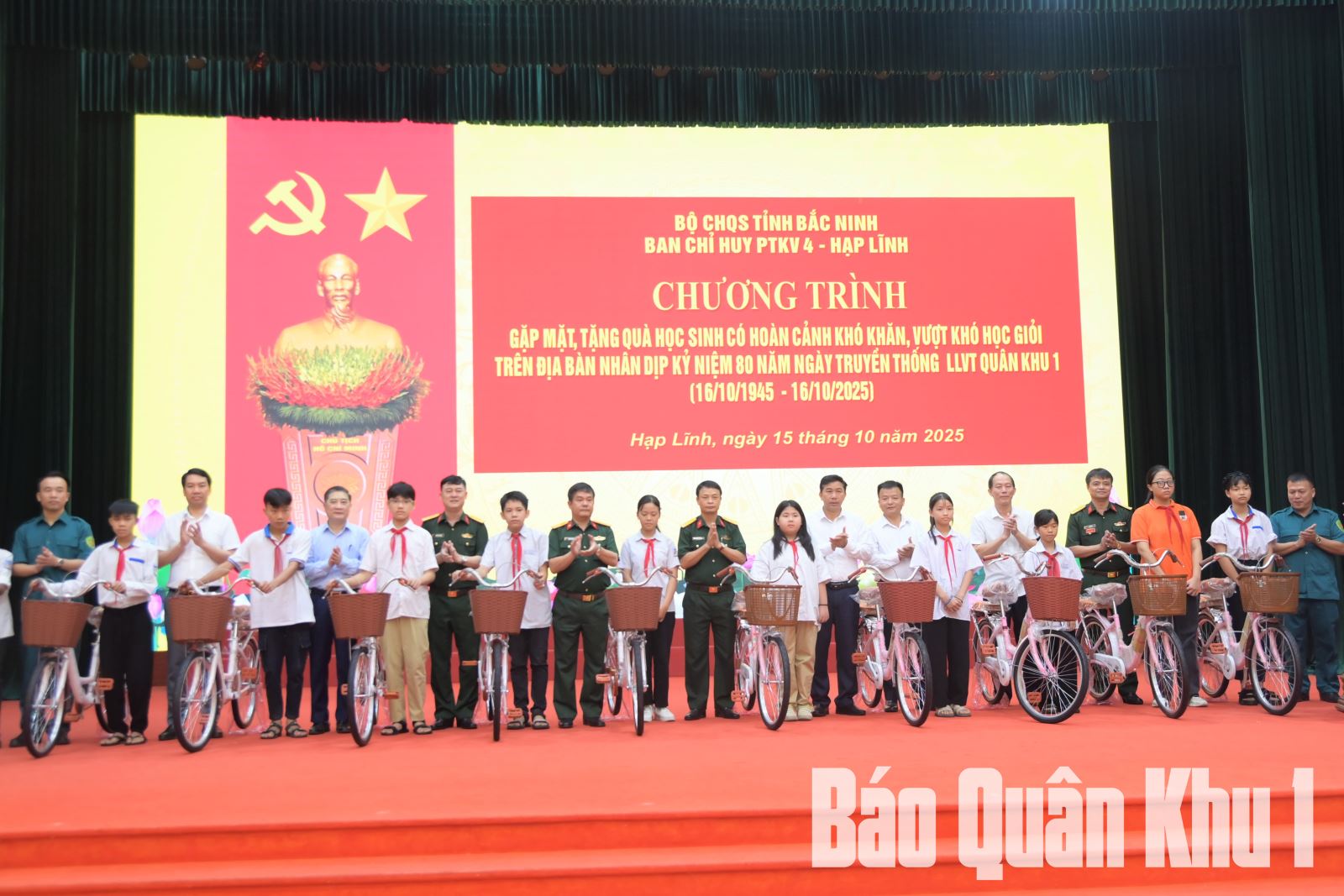 Nhân dịp kỷ niệm 80 năm Ngày truyền thống LLVT Quân khu (16/10/1945-16/10/2025), sáng 15-10, Ban chỉ huy PTKV 4 - Hạp Lĩnh (Bộ CHQS tỉnh Bắc Ninh) tổ chức tặng xe đạp cho các cháu học sinh có hoàn cảnh khó khăn, vượt khó học giỏi trên địa bàn đơn vị đóng quân.