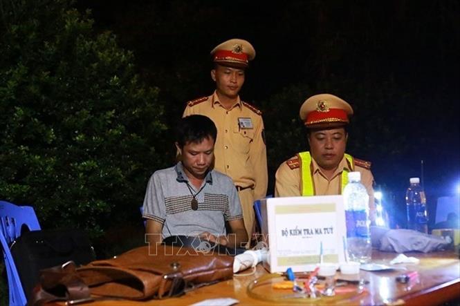 Trong quá trình thi hành nhiệm vụ đêm 18/5/2020, trên tuyến cao tốc Hà Nội - Lào Cai, Đội tuần tra kiếm soát giao thông đường bộ cao tốc số 1, thuộc Phòng 8, Cục Cảnh sát giao thông, Bộ Công an đã phát hiện lái xe Lưu Hồng Quân (SN 1987, thường trú Ngọc Vân Tân Yên, Bắc Giang) có sử dụng rượu và dương tính với ma túy. Ảnh: TTXVN phát