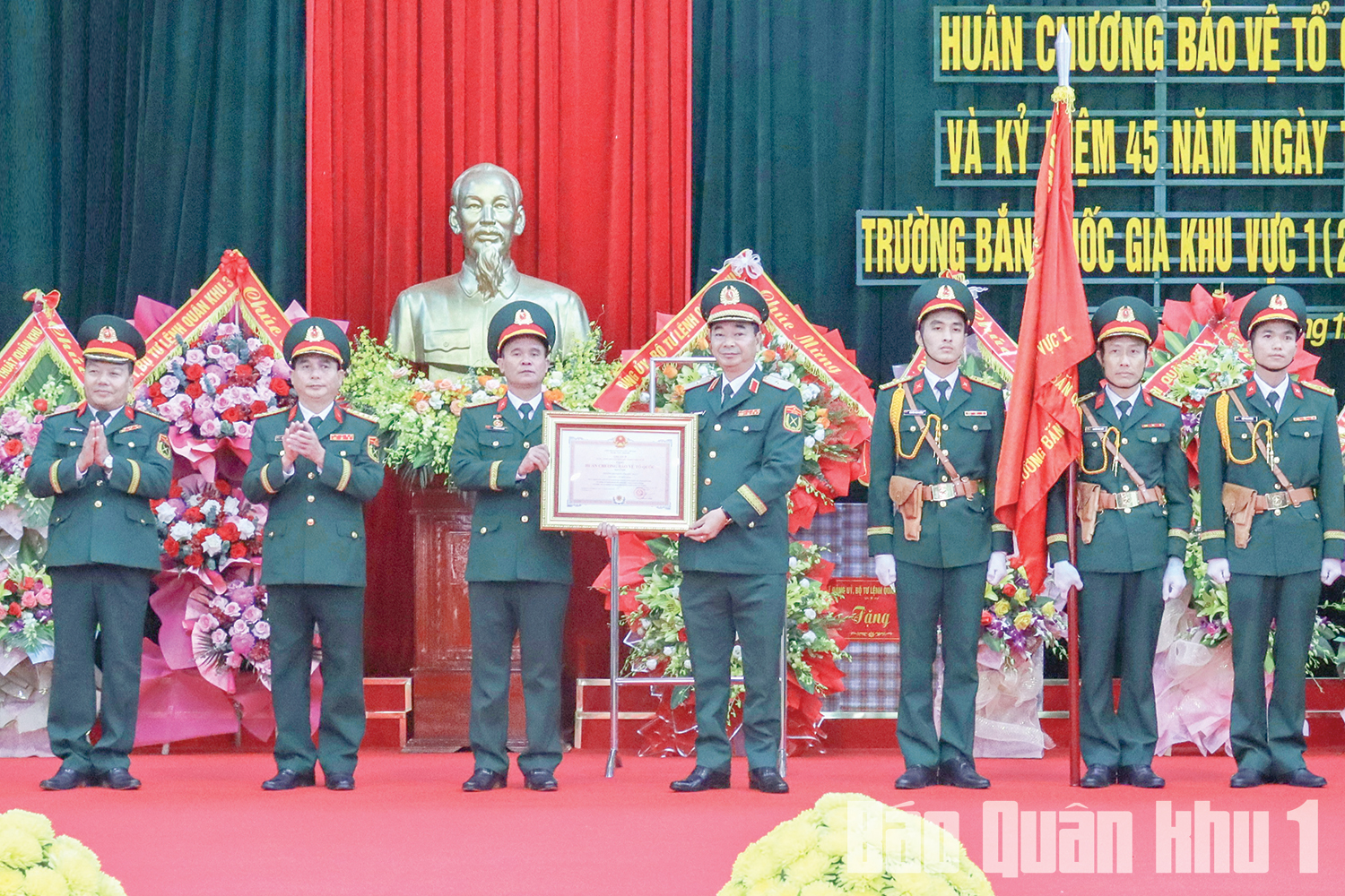 Thừa ủy quyền của Chủ tịch nước, Trung tướng Trương Mạnh Dũng, Tư lệnh Quân khu trao Huân chương Bảo vệ Tổ quốc hạng Nhì tặng Trường bắn Quốc gia khu vực 1 (tháng 11-2025). Ảnh: GIANG NAM