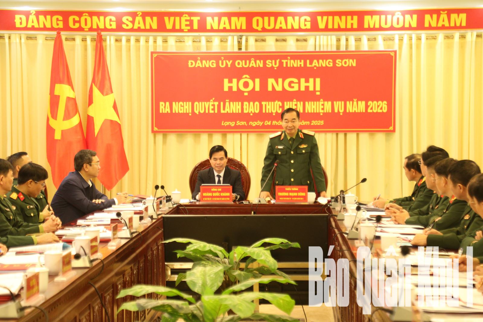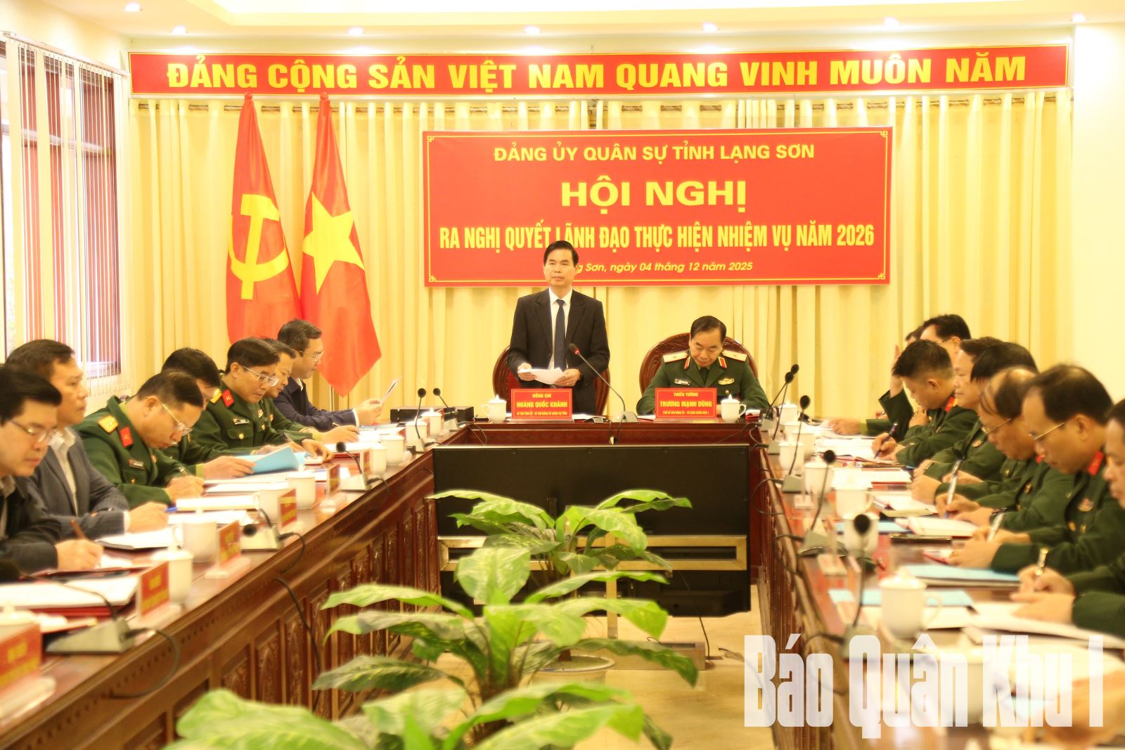 Sáng 4-12, Đảng ủy Quân sự tỉnh Lạng Sơn tổ chức hội nghị ra nghị quyết lãnh đạo thực hiện nhiệm vụ năm 2026. Đồng chí Hoàng Quốc Khánh, Bí thư Tỉnh ủy, Bí thư Đảng ủy Quân sự tỉnh Lạng Sơn chủ trì hội nghị; Thiếu tướng Trương Mạnh Dũng, Tư lệnh Quân khu dự, phát biểu chỉ đạo hội nghị.