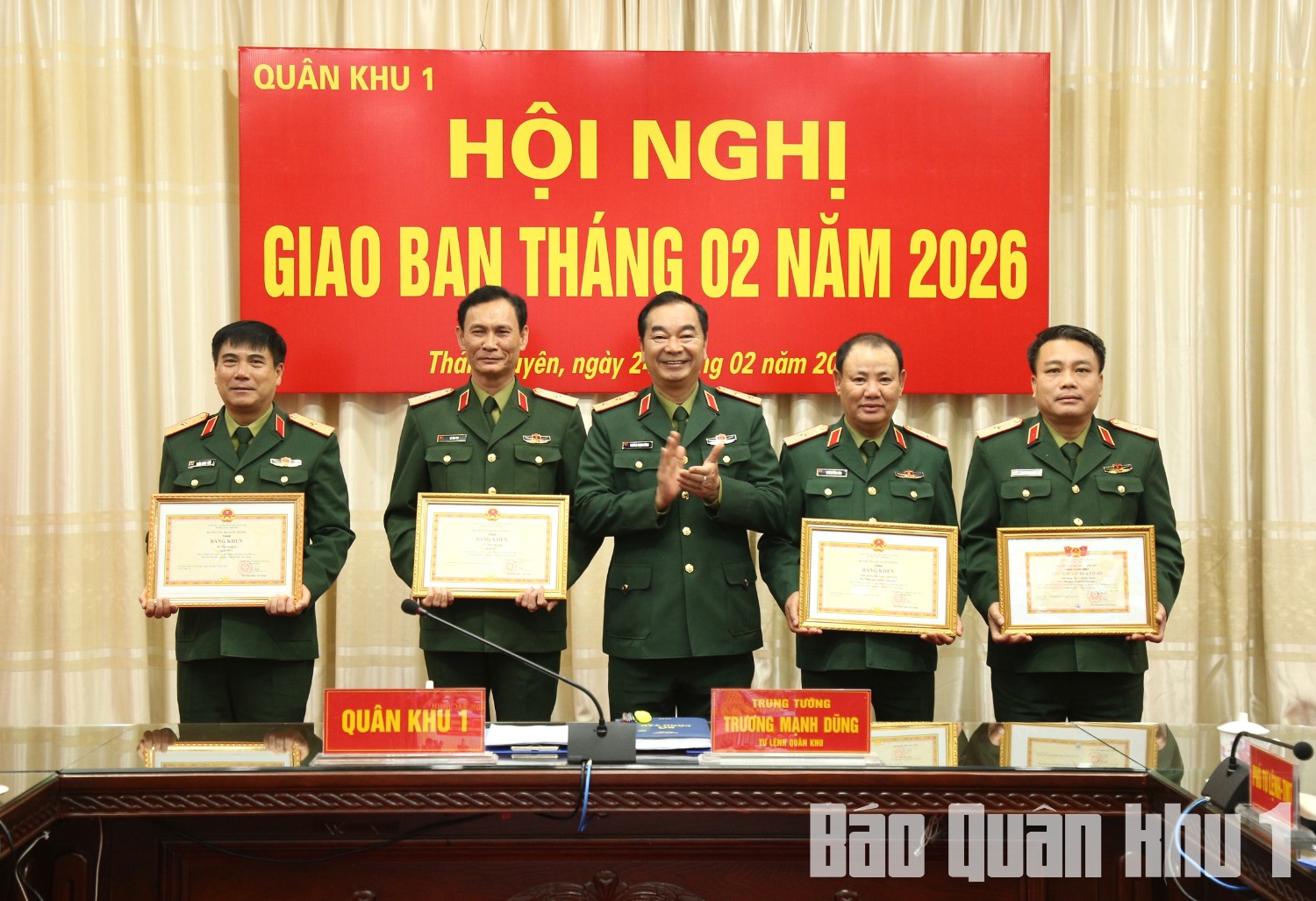 Trung tướng Trương Mạnh Dũng, Tư lệnh Quân khu trao Bằng khen của Bộ trưởng Bộ Quốc phòng tặng 3 tập thể, 4 cá nhân thuộc Quân khu 1 có thành tích xuất sắc tiêu biểu trong tham gia phục vụ Đại hội đại biểu toàn quốc lần thứ XIV của Đảng.