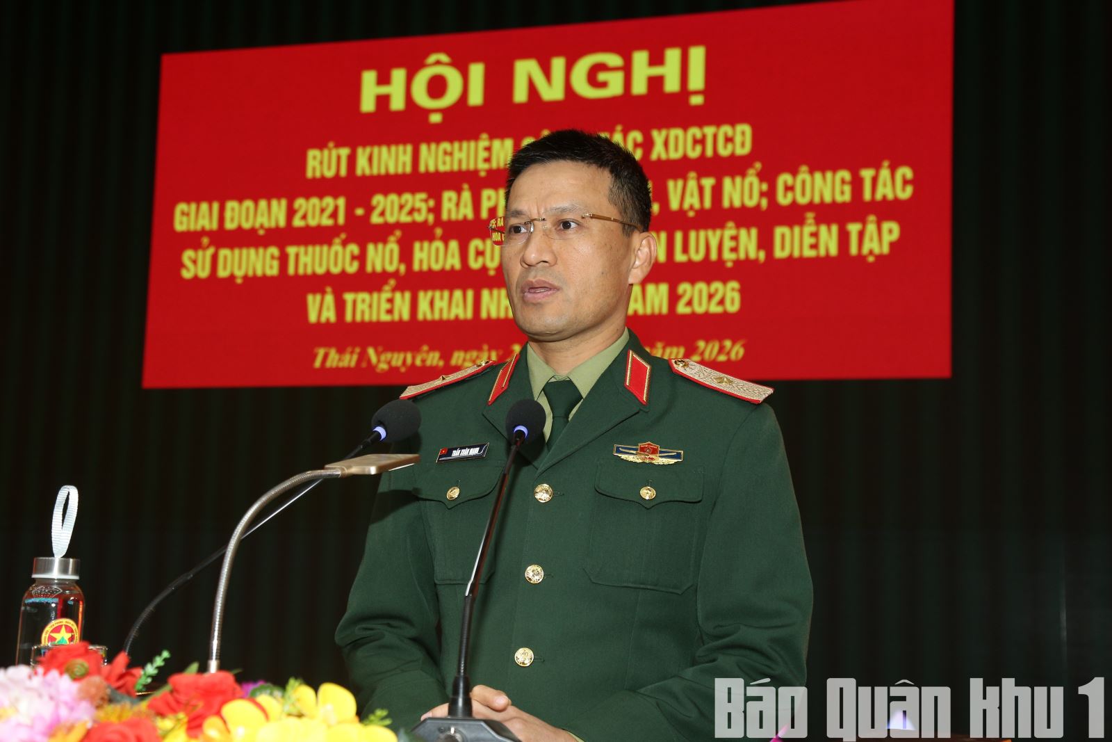 Sáng 22-1, Quân khu tổ chức Hội nghị rút kinh nghiệm công tác xây dựng công trình chiến đấu giai đoạn 2021-2025; công tác rà phá bom mìn, vật nổ; công tác sử dụng thuốc nổ, hỏa cụ trong huấn luyện, diễn tập và triển khai nhiệm vụ năm 2026. Thiếu tướng Trần Xuân Mạnh, Phó Tư lệnh, Tham mưu trưởng Quân khu chủ trì hội nghị.