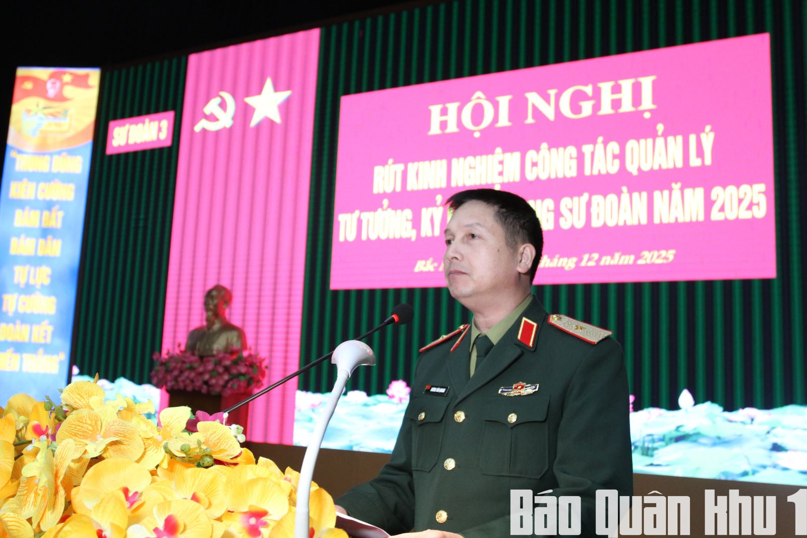 Phát biểu chỉ đạo hội nghị, Thiếu tướng Dương Văn Quang ghi nhận và nhiệt liệt biểu dương, chúc mừng những thành tích mà Sư đoàn 3 đã đạt được trong năm 2025. Đồng chí Phó Chính ủy Quân khu yêu cầu cấp ủy, chỉ huy Sư đoàn trong thời gian tới thực hiện tốt các nội dung trọng tâm: Đề cao vai trò, trách nhiệm nêu gương của người đứng đầu. Mỗi cán bộ phải thực sự gương mẫu, tâm huyết, gần gũi bộ đội; đánh giá, sử dụng cán bộ khách quan, thực chất, kiên quyết chống biểu hiện cục bộ, duy ý chí trong công tác cán bộ. Lấy tình thương yêu đồng chí, đồng đội làm nền tảng phòng ngừa vi phạm. Kết hợp chặt chẽ giữa kỷ luật nghiêm minh với sự quan tâm, chia sẻ; thực hiện tốt “3 cùng”, “5 nắm”, kịp thời nắm bắt, giải quyết khó khăn về tư tưởng, hoàn cảnh của bộ đội, không để phát sinh điểm nóng. Tiếp tục đổi mới hình thức giáo dục, quản lý tư tưởng, kỷ luật phù hợp thực tiễn; phát huy hiệu quả các mô hình, quản lý chặt chẽ các mối quan hệ xã hội, nhất là trên không gian mạng, chủ động phòng ngừa vi phạm từ sớm. Tăng cường phối hợp chặt chẽ giữa đơn vị – gia đình – địa phương; sử dụng hiệu quả các kênh thông tin hai chiều, làm tốt công tác hậu phương quân đội, tạo sự đồng thuận trong quản lý, giáo dục bộ đội.