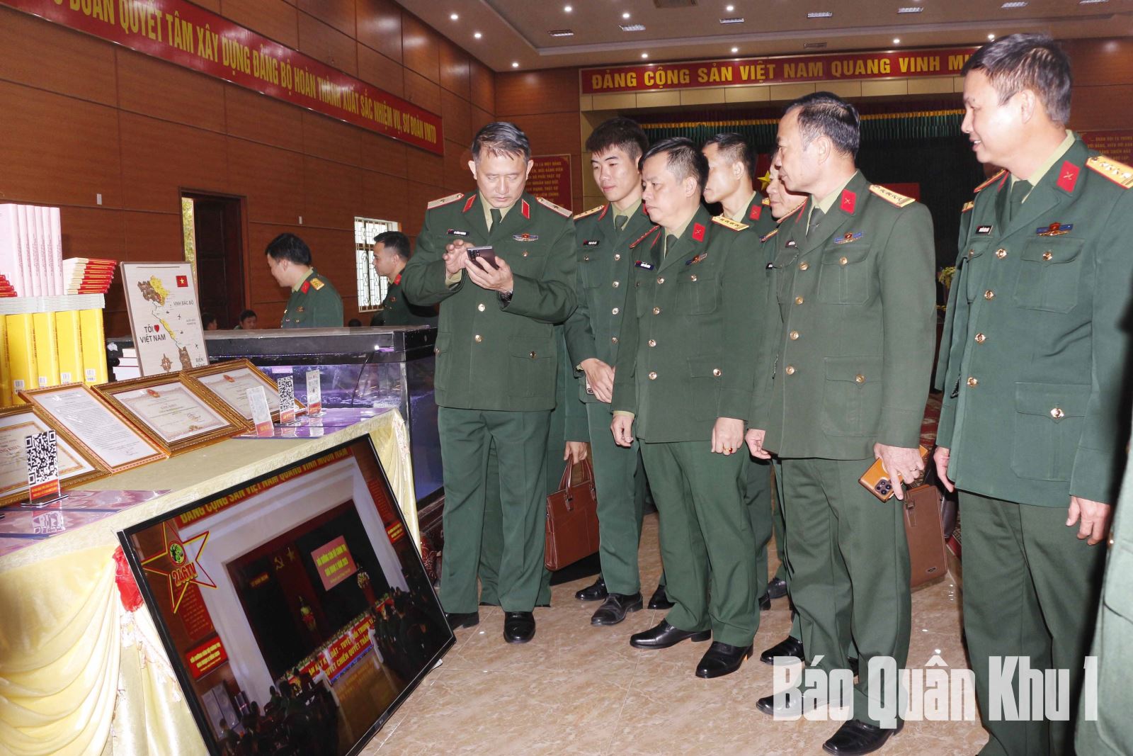 Các đại biểu tham quan trưng bày mô hình Sư đoàn áp dụng chuyển đổi số vào trong chương trình giáo dục chính trị.