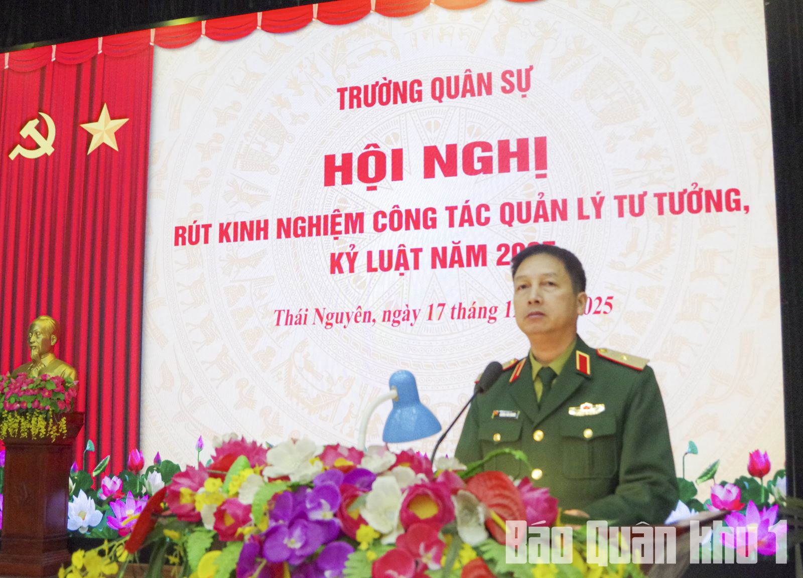 Phát biểu chỉ đạo tại hội nghị, Thiếu tướng Dương Văn Quang ghi nhận, đánh giá cao những kết quả mà Đảng ủy, Ban Giám hiệu Nhà trường đã đạt được trong công tác quản lý tư tưởng, kỷ luật. Đồng thời yêu cầu Nhà trường tiếp tục phát huy vai trò lãnh đạo của cấp ủy, trách nhiệm của đội ngũ cán bộ chủ trì; thường xuyên nắm chắc, dự báo sát tình hình tư tưởng; quản lý chặt chẽ, định hướng đúng, giải quyết kịp thời các vấn đề nảy sinh; giữ nghiêm kỷ luật, kỷ cương, bảo đảm an toàn tuyệt đối.