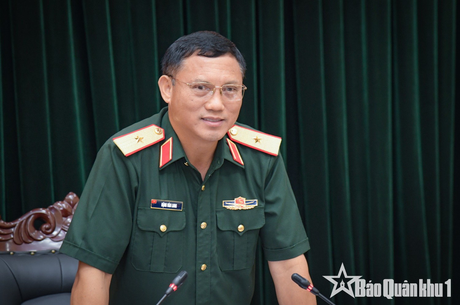 Trung tướng La Công Phương, Ủy viên Trung ương Đảng, Bí thư Đảng ủy, Chính ủy Quân khu phát biểu tại hội nghị.