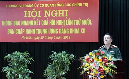 Sáng 29-5, Thường vụ Đảng ủy Cơ quan Tổng cục Chính trị (TCCT) đã tổ chức hội nghị quán triệt, thông báo nhanh kết quả Hội nghị lần thứ mười, Ban Chấp hành Trung ương Đảng Khóa XII cho các cán bộ chủ chốt.