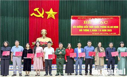 Chiều 18-11, Bộ CHQS tỉnh Thái Nguyên tổ chức bế mạc lớp bồi dưỡng kiến thức quốc phòng và an ninh đối tượng 3 năm 2025. Dự buổi lễ có Đại tá Ma Công Học, Chính ủy Bộ CHQS tỉnh Thái Nguyên.