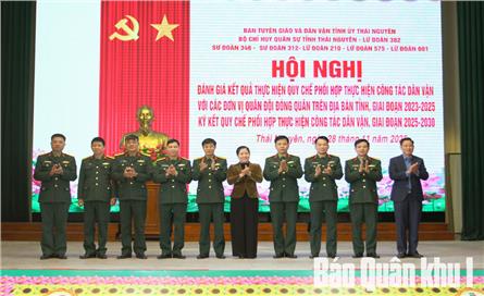Sáng 28-11, tại Lữ đoàn 382, Ban Tuyên giáo và Dân vận Tỉnh ủy Thái Nguyên phối hợp với Bộ CHQS tỉnh và các đơn vị quân đội đứng chân trên địa bàn gồm Lữ đoàn 382, 210, 575, 601; Sư đoàn 346 (Quân khu 1); Sư đoàn 312 (Quân đoàn 12) tổ chức Hội nghị đánh giá kết quả thực hiện quy chế phối hợp công tác dân vận giai đoạn 2020-2025 và ký kết quy chế phối hợp giai đoạn 2025-2030. Dự hội nghị có Đại tá Vũ Bá Bộ, Phó Chủ nhiệm Chính...