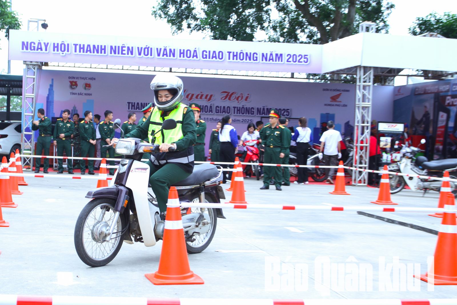 Ngay từ đầu chương trình, hơn 1.000 cán bộ, đoàn viên thanh niên, chiến sĩ thuộc các cơ quan, đơn vị LLVT trên địa bàn tỉnh Bắc Ninh đã cùng tham gia nhiều hoạt động phong phú, hấp dẫn. Các nội dung trọng tâm của Ngày hội gồm: Phát động phong trào hành động “Thanh niên Quân đội với Văn hoá giao thông” năm 2025, khẳng định quyết tâm của tuổi trẻ LLVT tỉnh Bắc Ninh trong việc xây dựng văn hoá giao thông an toàn, lành mạnh; tổ chức Hội thi “Thanh niên Quân đội với Văn hoá giao thông” bằng hình thức sân khấu hoá sinh động, qua đó nâng cao kiến thức pháp luật, kỹ năng xử lý tình huống khi tham gia giao thông; hướng dẫn kỹ thuật lái xe mô tô an toàn, khoa học, giúp đoàn viên thanh niên rèn luyện kỹ năng thực hành, nhận diện và phòng tránh rủi ro khi tham gia giao thông; triển lãm hình ảnh, pano tuyên truyền, giới thiệu các mô hình hay, cách làm sáng tạo trong việc thực hiện văn hoá giao thông trong quân đội.