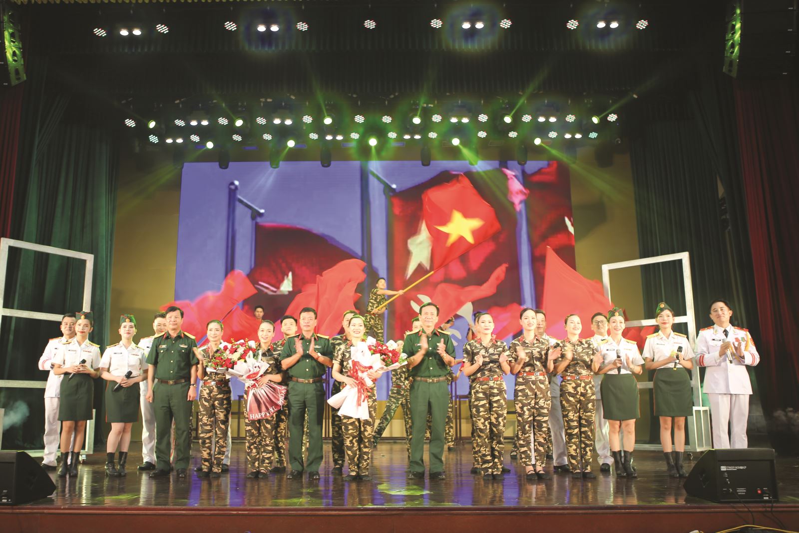 Lãnh đạo, chỉ huy Cục Kỹ thuật tặng hoa chúc mừng đội văn nghệ tham gia Liên hoan nghệ thuật quần chúng LLVT Quân khu năm 2023. Ảnh: TH