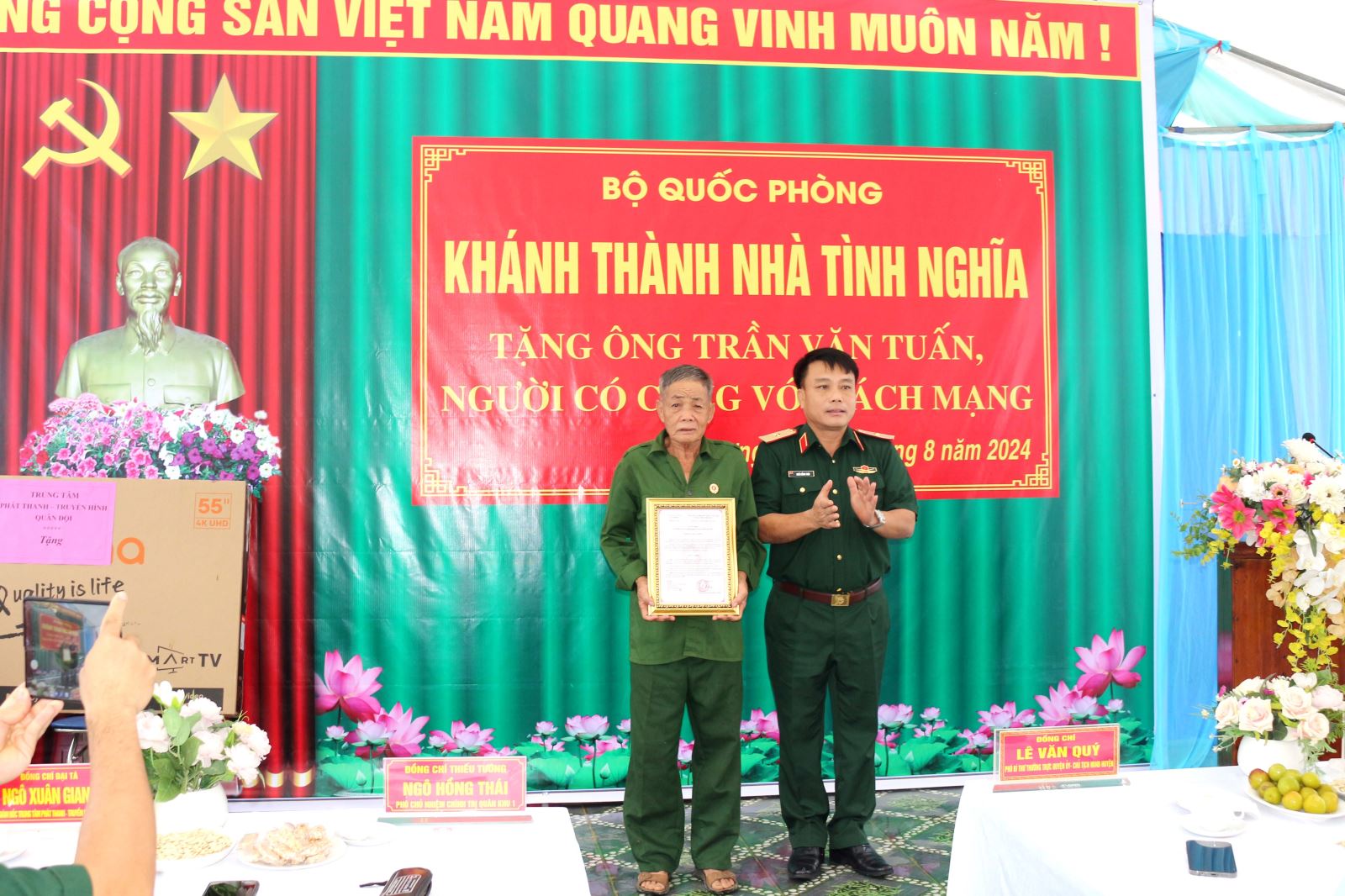 Thiếu tướng Ngô Hồng Thái, Phó chủ nhiệm Chính trị Quân khu trao quyết định hỗ trợ xây dựng Nhà tình nghĩa tặng gia đình ông Trần Văn Tuấn.