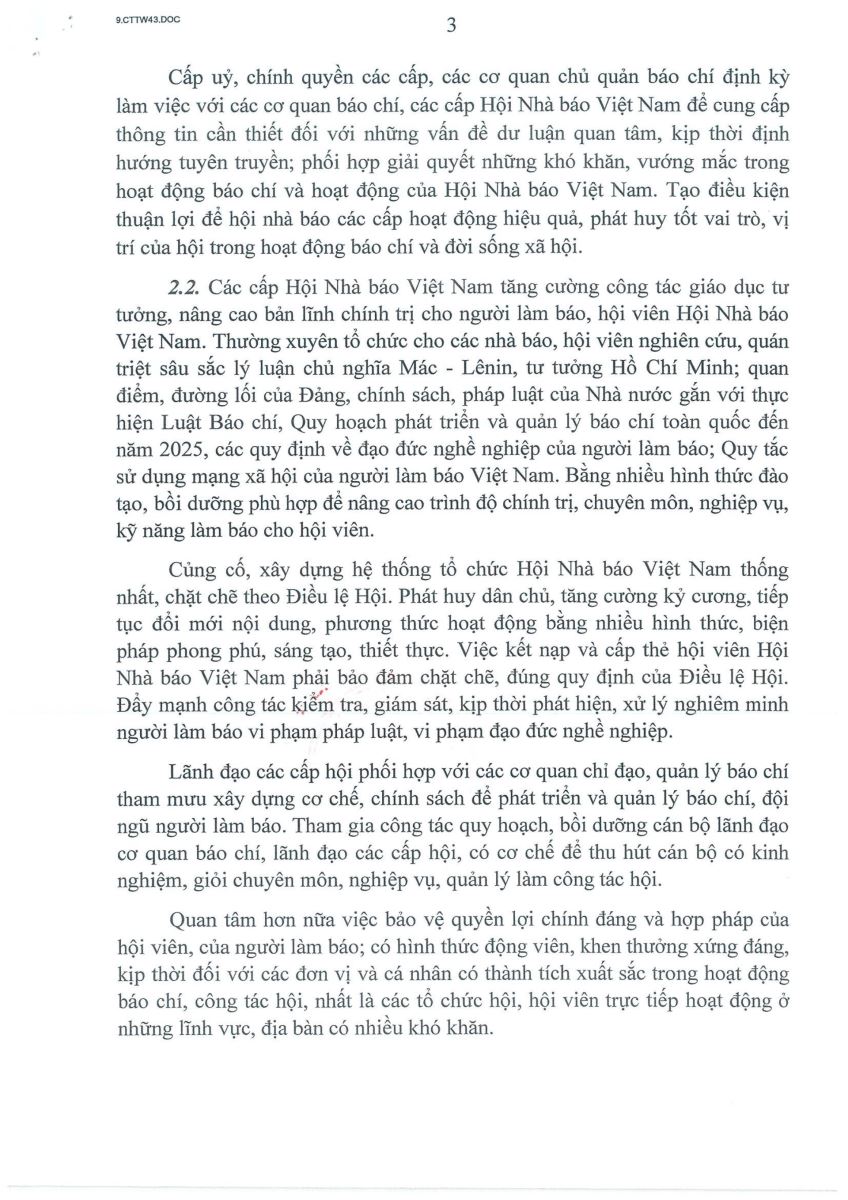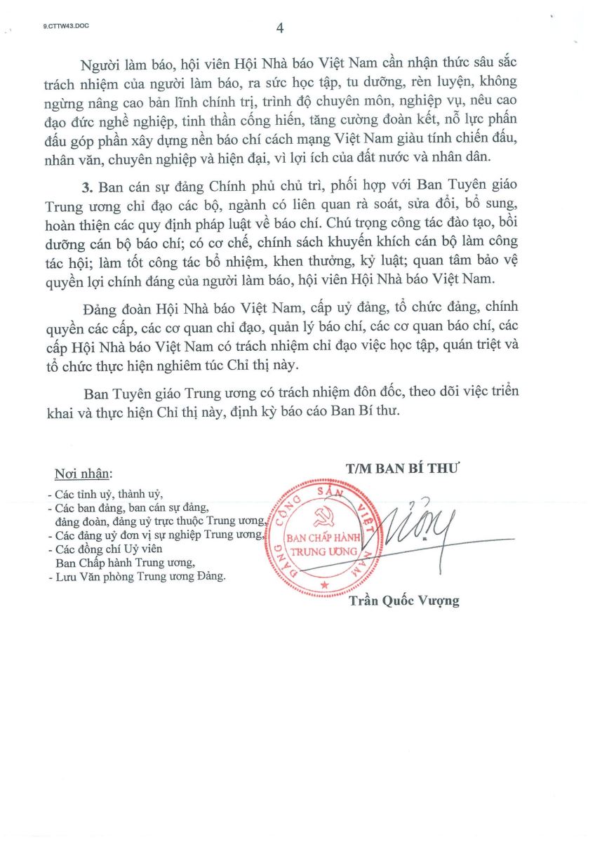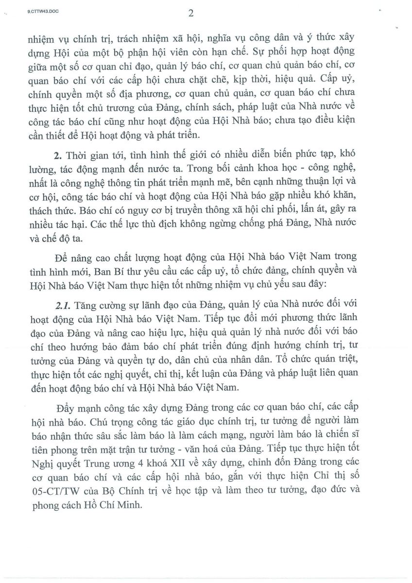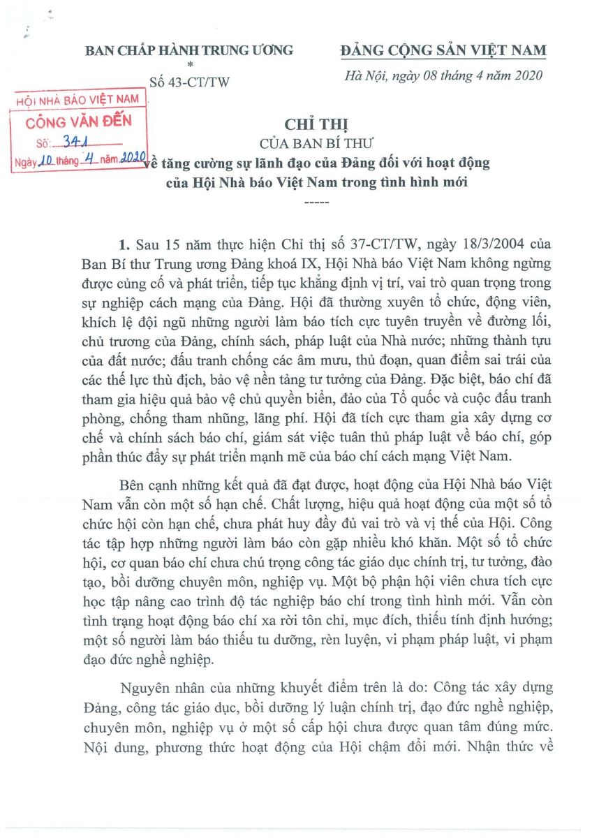 Chỉ thị số 43-CT/TW của Ban Bí thư về tăng cường sự lãnh đạo của Đảng đối với hoạt động của Hội Nhà báo Việt Nam trong tình hình mới