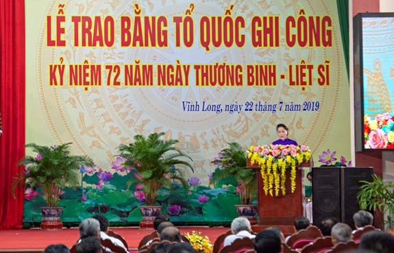 Nói chuyện với Mẹ Việt Nam Anh hùng, các nữ thương binh, Chủ tịch Quốc hội cho biết, kỷ niệm 72 năm Ngày Thương binh, Liệt sĩ, tại Vĩnh Long đã diễn ra Lễ trao 72/468 Bằng Tổ quốc ghi công cho thân nhân liệt sĩ trên cả nước; khẳng định, Đảng, Nhà nước và nhân dân mãi mãi khắc ghi công lao to lớn của các bậc cách mạng tiền bối, các anh hùng liệt sĩ, các thương binh và những người có công với nước.