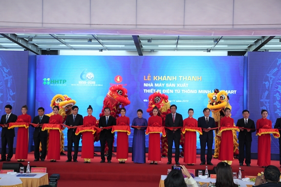 Chủ tịch Quốc hội Nguyễn Thị Kim Ngân và các đại biểu cắt băng khánh thành nhà máy sản xuất thiết bị điện tử thông minh Vinsmart.