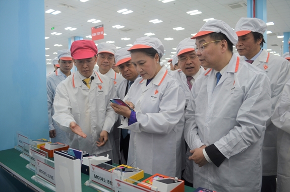 Chủ tịch Quốc hội Nguyễn Thị Kim Ngân và các đại biểu tham quan nhà máy sản xuất thiết bị điện tử thông minh Vinsmart.