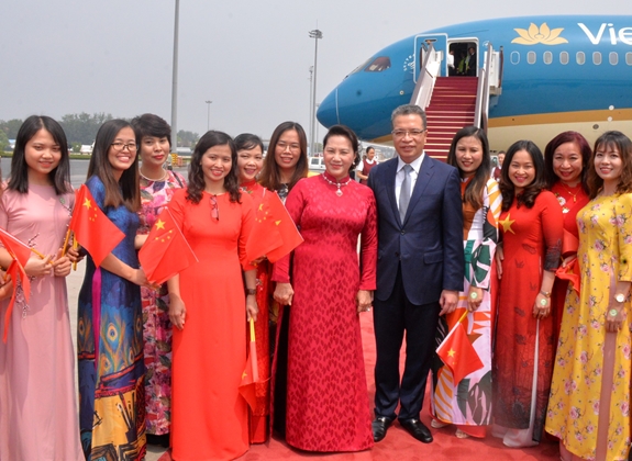 Đón Chủ tịch Quốc hội Nguyễn Thị Kim Ngân tại sân bay, phía Trung Quốc có Phó tổng thư ký Nhân đại toàn quốc Trung Quốc Hồ Hiểu Lê, hàm Cục trưởng Cục Ngoại sự Văn phòng Nhân đại toàn quốc Trung Quốc Vương Văn; phía Việt Nam có một số cán bộ, nhân viên Đại sứ quán Việt Nam tại Trung Quốc và đại diện cộng đồng người Việt Nam tại Bắc Kinh.