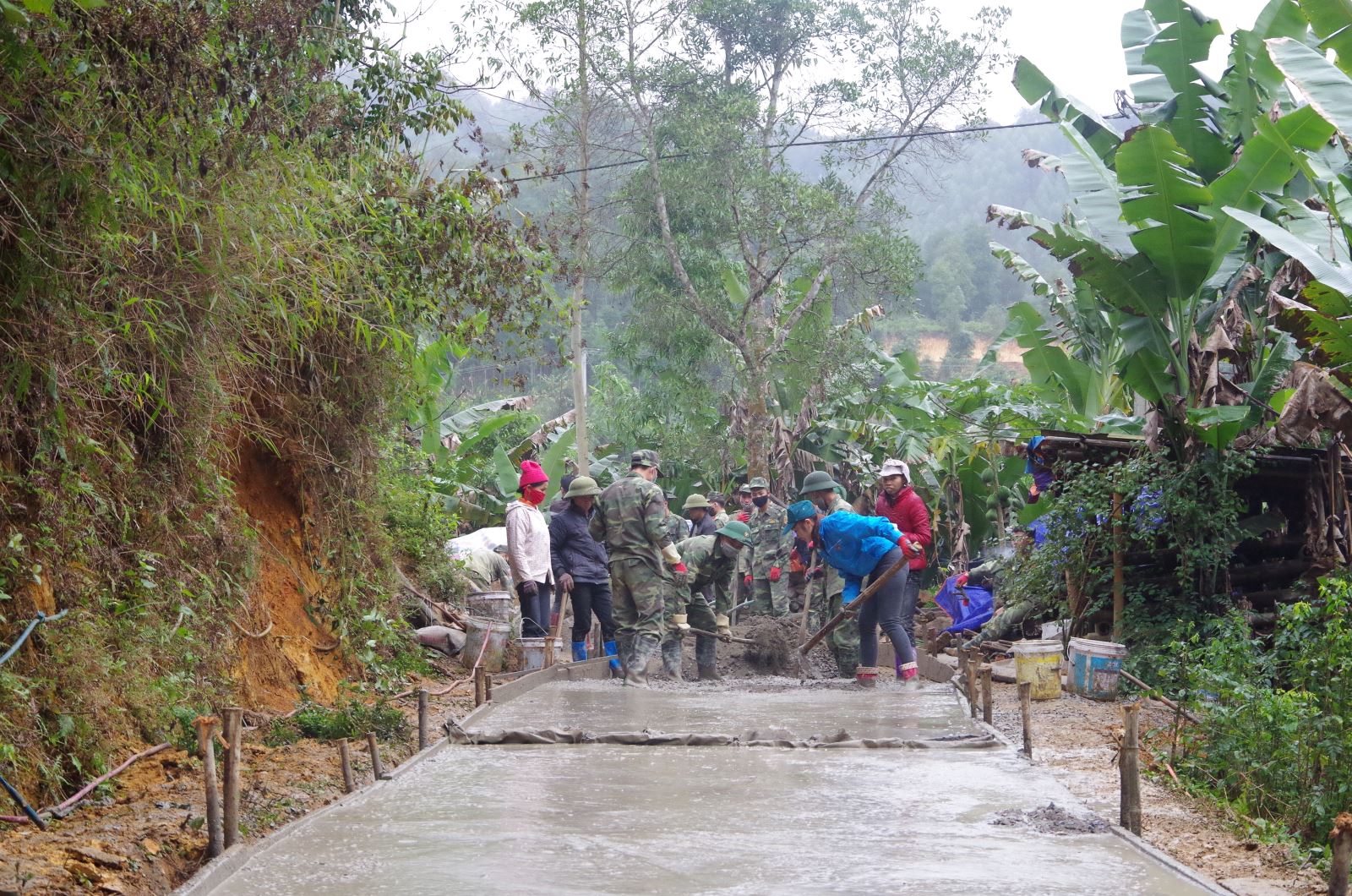 Cán bộ, chiến sĩ Trung đoàn 123 giúp nhân dân xã Đề Thám, huyện Tràng Định, tỉnh Lạng Sơn làm đường bê tông.
