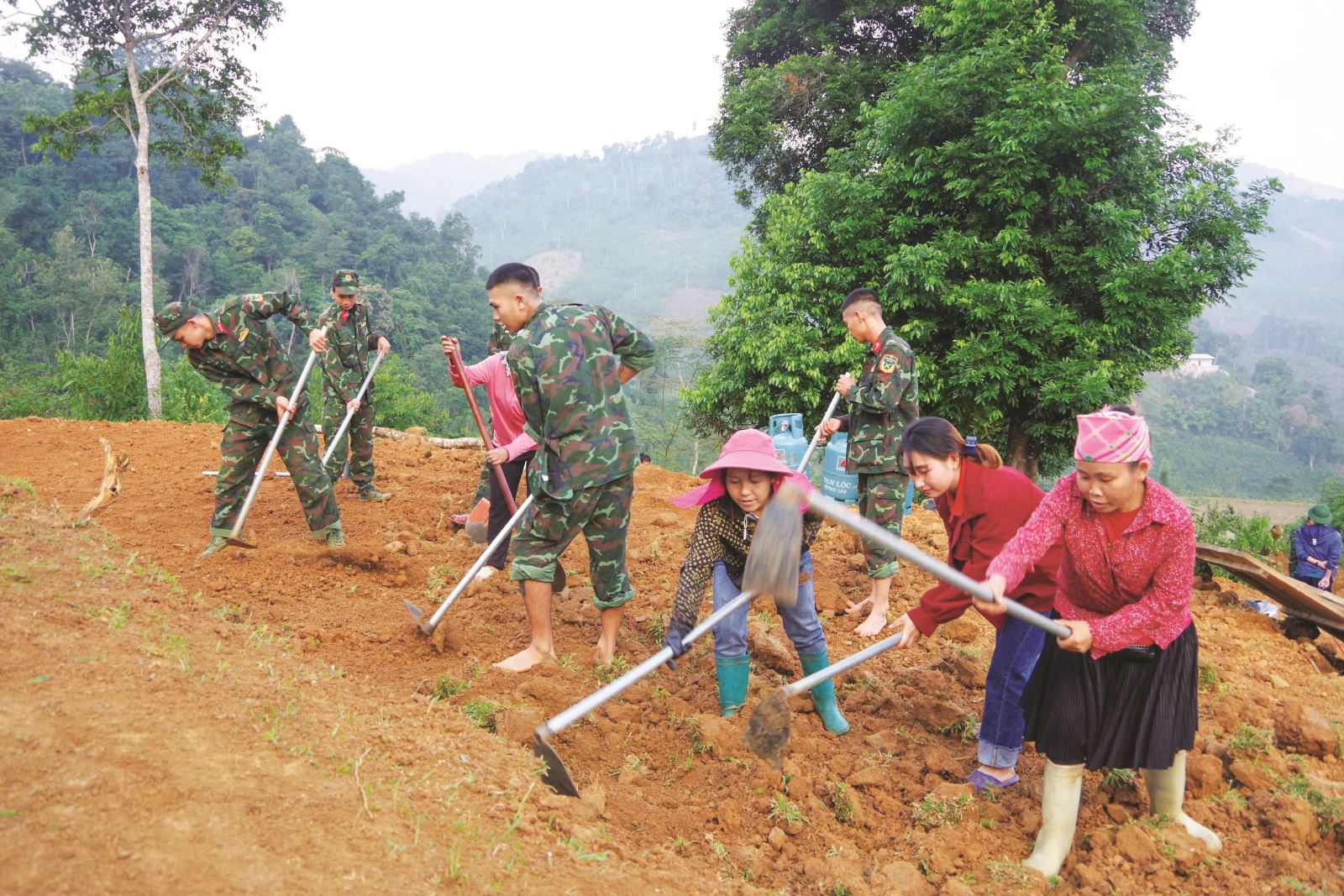 Cán bộ, chiến sĩ Bộ CHQS tỉnh Bắc Kạn tham gia làm mặt bằng xây dựng nhà tái định cư tại thôn Tà Han, xã Xuân Lạc, huyện Chợ Đồn. Ảnh: NAM TRANG
