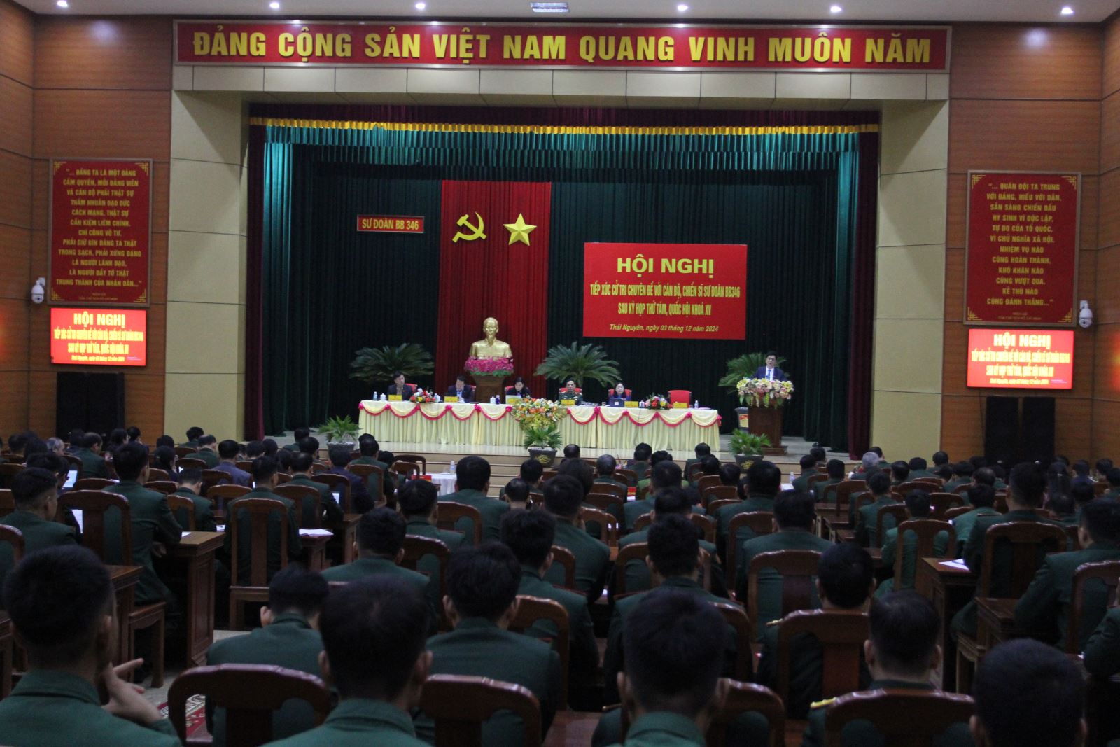 Phát biểu tại hội nghị, Đại tướng Phan Văn Giang khái quát lịch sử và truyền thống vẻ vang của Sư đoàn 346; bày tỏ phấn khởi trước bước phát triển lớn mạnh và thành tích mà cán bộ, chiến sĩ đơn vị đạt được trong thời gian qua. Đại tướng Phan Văn Giang thông tin về những nội dung chính, nhất là những thông tin liên quan đến công tác quân sự, quốc phòng tại Kỳ họp thứ tám, Quốc hội khóa XV vừa diễn ra. Đại tướng Phan Văn Giang nhấn mạnh, tại kỳ họp vừa qua, các luật do Bộ Quốc phòng chủ trì xây dựng đều được Quốc hội thông qua, với tỷ lệ đại biểu tán thành gần như tuyệt đối. Có được kết quả đó là do các cơ quan, đơn vị chức năng Bộ Quốc phòng đã có sự chuẩn bị chu đáo, nghiêm túc, chất lượng; quá trình xây dựng, luôn cầu thị, tiếp thu, lĩnh hội ý kiến rộng rãi của các chuyên gia, cơ quan chức năng trong và ngoài Quân đội, trong đó có đội ngũ cán bộ, sĩ quan toàn quân.