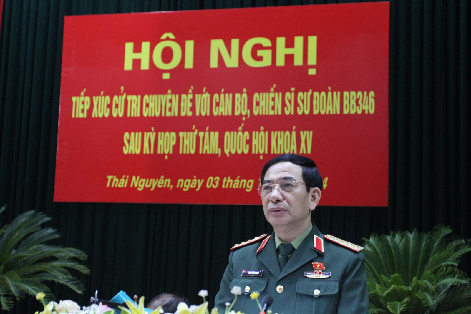 Sáng 3-12, tại Thái Nguyên, Đại tướng Phan Văn Giang, Ủy viên Bộ Chính trị, Phó bí thư Quân ủy Trung ương, Bộ trưởng Bộ Quốc phòng, Đại biểu Quốc hội khóa XV cùng các đồng chí trong Đoàn đại biểu Quốc hội tỉnh Thái Nguyên có buổi tiếp xúc cử tri chuyên đề với cán bộ, chiến sĩ Sư đoàn 346 sau Kỳ họp thứ tám, Quốc hội khóa XV.