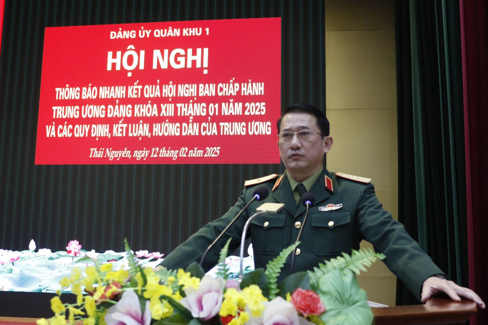 Tại hội nghị, Thiếu tướng La Công Phương, Bí thư Đảng ủy, Chính ủy Quân khu đã thông báo nhanh kết quả Hội nghị Ban Chấp hành Trung ương Đảng khóa XIII (tháng 1-2025), gồm các nội dung: Báo cáo tổng kết việc thực hiện Nghị quyết số 18-NQ/TW, ngày 25/10/2017 của Ban Chấp hành Trung ương Đảng khóa XII về một số vấn đề tiếp tục đổi mới, sắp xếp tổ chức bộ máy của hệ thống chính trị tinh, gọn, hoạt động hiệu lực, hiệu quả; Báo cáo kiểm điểm sự lãnh đạo, chỉ đạo của Bộ Chính trị, Ban Bí thư năm 2024; Đề án bổ sung về phát triển kinh tế - xã hội năm 2025 với mục tiêu tăng trưởng 8% trở lên; Đề án bổ sung báo cáo đánh giá 5 năm thực hiện Chiến lược phát triển kinh tế – xã hội 10 năm 2021 – 2030, phương hướng, nhiệm vụ phát triển kinh tế – xã hội 5 năm 2026 – 2030 với mục tiêu tăng trưởng giai đoạn 2026 – 2030 đạt hai con số liên tục trong các năm và một số nội dung về công tác cán bộ.