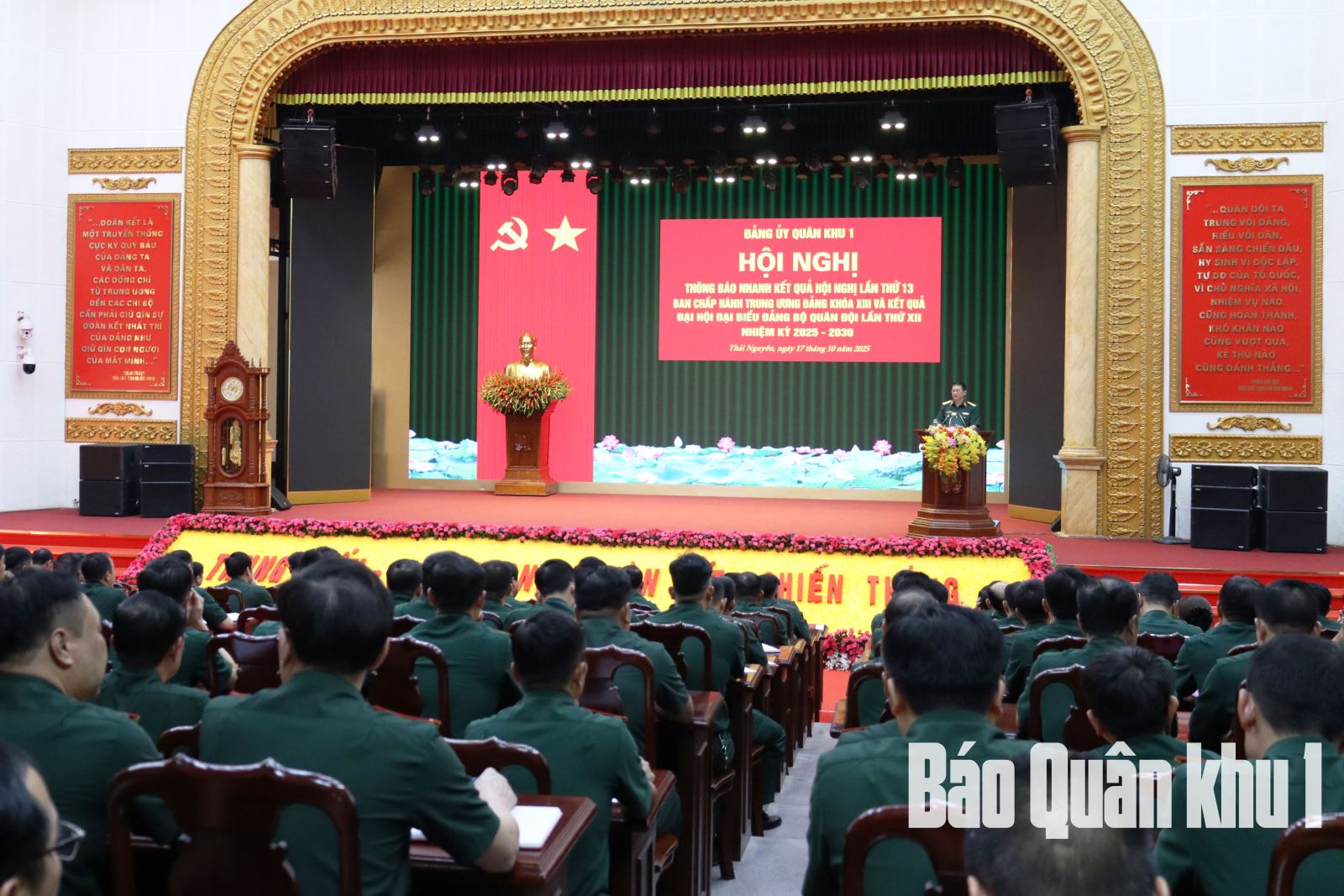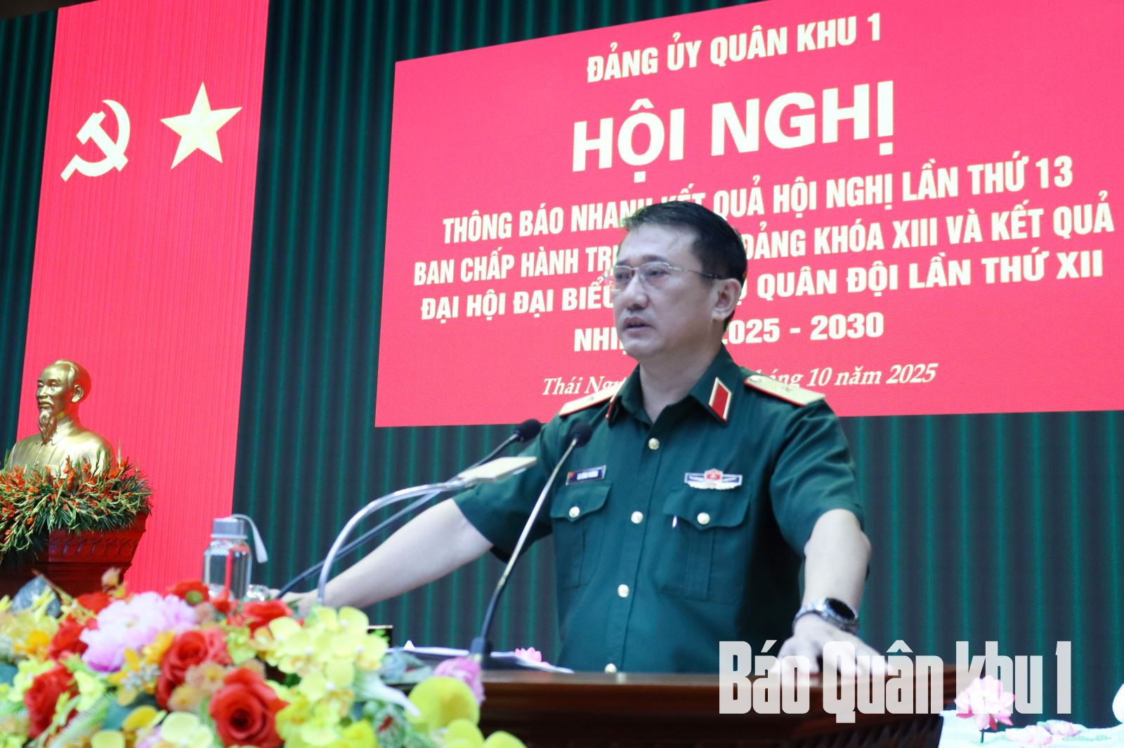 Trên cơ sở thông tin nhanh kết quả Hội nghị lần thứ 13 Ban Chấp hành Trung ương Đảng khóa XIII và kết quả Đại hội đại biểu Đảng bộ Quân đội lần thứ XII, nhiệm kỳ 2025 – 2030, đồng chí Bí thư Đảng ủy, Chính ủy Quân khu yêu cầu cán bộ, đảng viên LLVT Quân khu nắm bắt kịp thời chủ trương, định hướng lớn của Đảng và Quân ủy Trung ương, qua đó củng cố niềm tin, thống nhất ý chí, hành động, tạo động lực mới để LLVT Quân khu 1 hoàn thành xuất sắc mọi nhiệm vụ được giao trong thời gian tới.