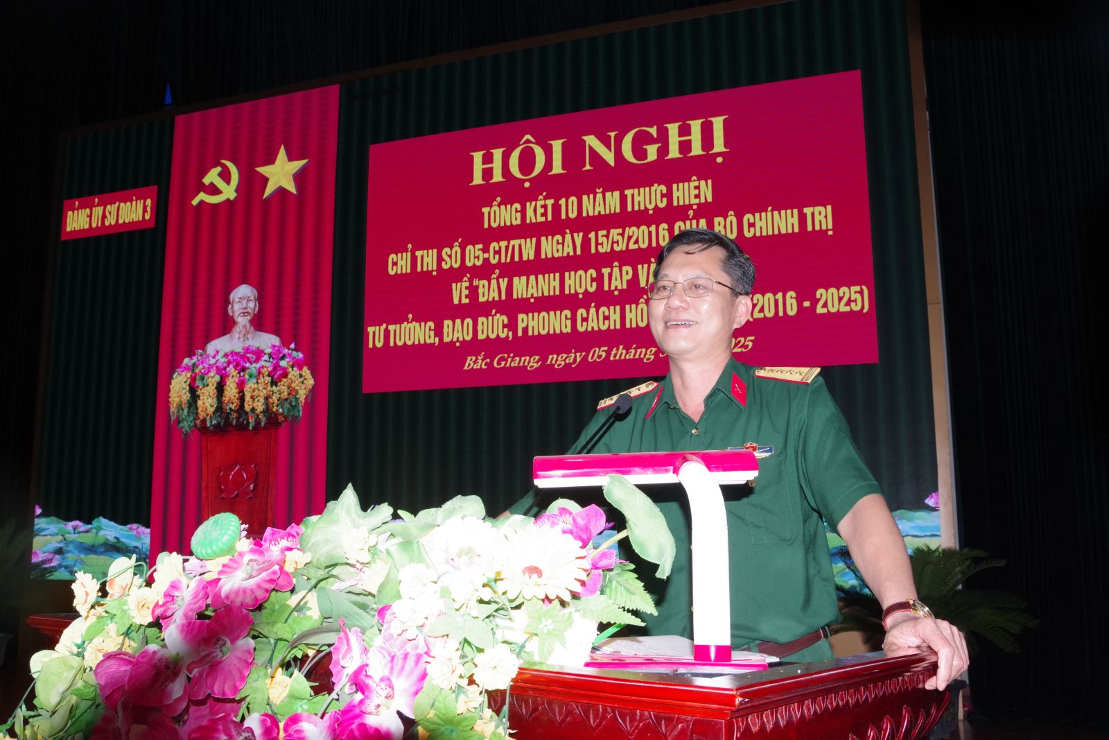 Sáng 5-5, Đảng ủy Sư đoàn 3 tổng kết 10 năm thực hiện Chỉ thị số 05-CT/TW ngày 15-5-2016 của Bộ Chính trị về đẩy mạnh học tập và làm theo tư tưởng, đạo đức, phong cách Hồ Chí Minh, giai đoạn 2016 - 2025. Đại tá Nông Tiến Dũng, Phó Chủ nhiệm Chính trị Quân khu dự và chỉ đạo Hội nghị. Đại tá Hứa Chiến Thắng, Bí thư Đảng ủy, Chính ủy Sư đoàn 3 chủ trì Hội nghị.