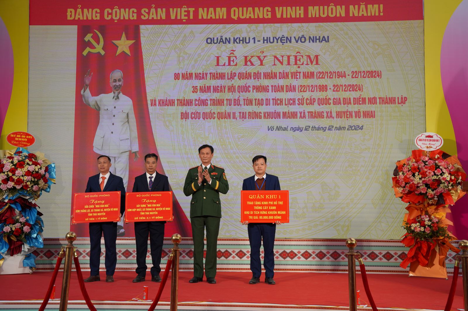 Thiếu tướng Lê Văn Thơ, Chủ nhiệm Chính trị Quân khu trao kinh phí hỗ trợ xây dựng, sửa chữa nhà văn hóa, trồng cây xanh tại xã Tràng Xá, huyện Võ Nhai, tỉnh Thái Nguyên. Ảnh: GIANG NAM