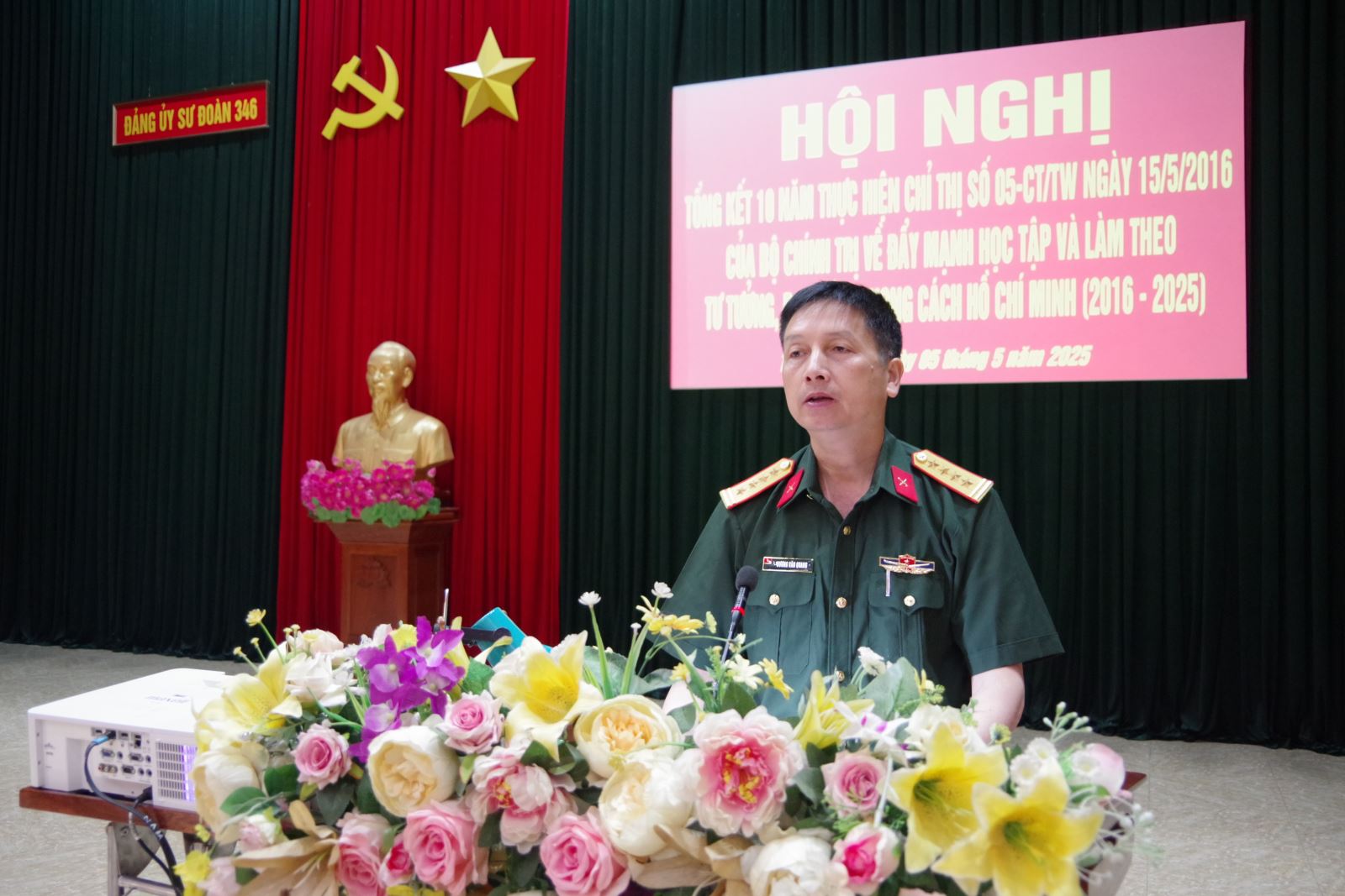 Ngày 5-5, Đảng ủy Sư đoàn 346, tổ chức Hội nghị tổng kết 10 năm thực hiện Chỉ thị số 05-CT/TW, ngày 15-5-2016 của Bộ Chính trị về “Đẩy mạnh học tập và làm theo tư tưởng, đạo đức, phong cách Hồ Chí Minh” giai đoạn 2016-2025. Đại tá Dương Văn Quang, Phó Chủ nhiệm Chính trị Quân khu dự và chỉ đạo Hội nghị.