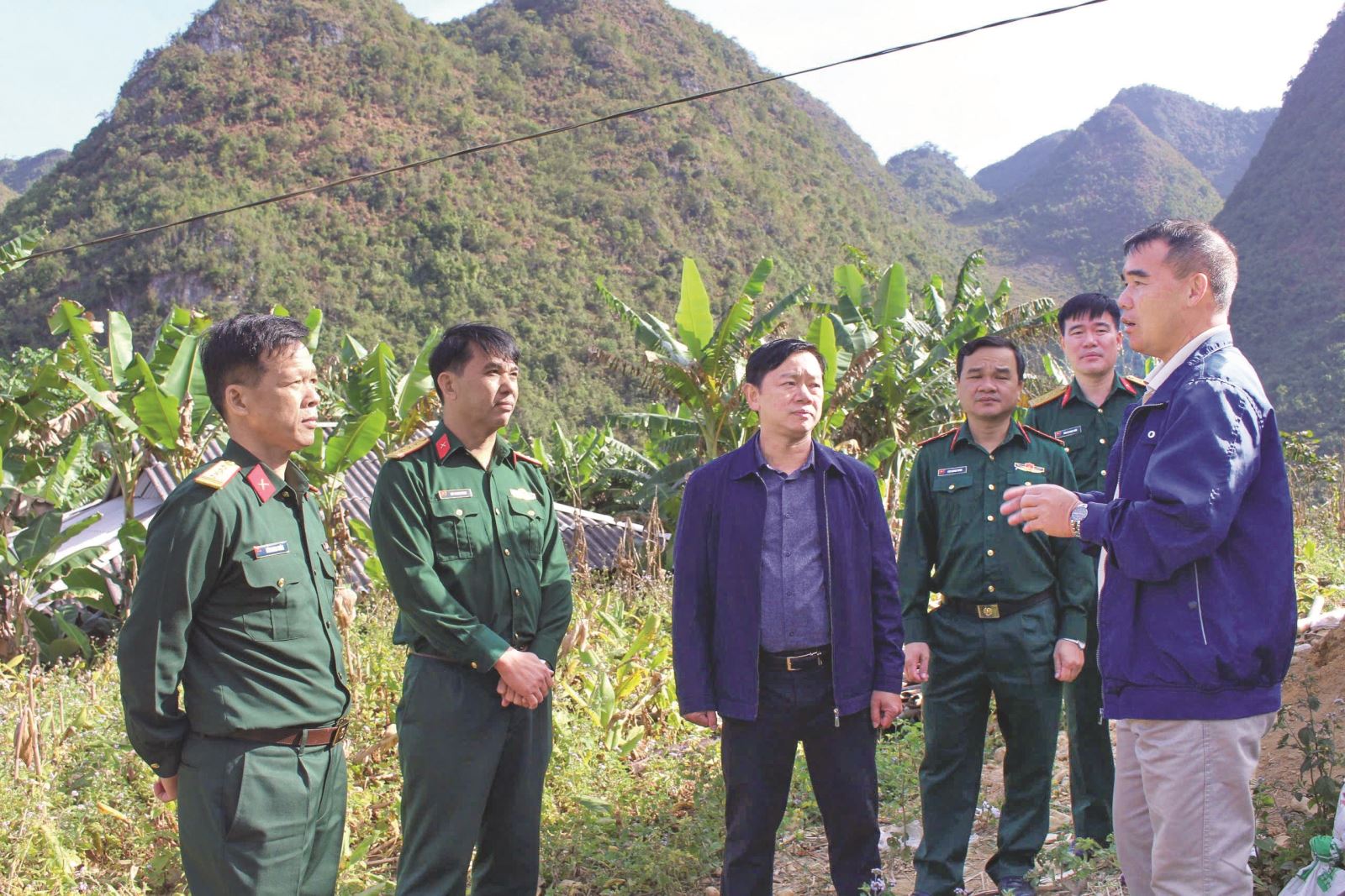 Lãnh đạo Bộ CHQS tỉnh Cao Bằng khảo sát xây khu tái định cư tại xóm Lũng Cắm, xã Huy Giáp, huyện Bảo Lạc. Ảnh: VIỆT HÒA