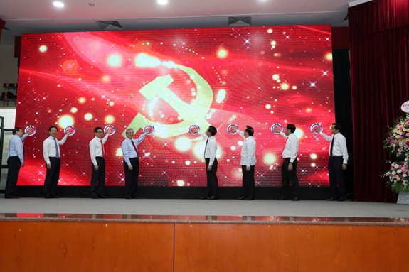 Các đồng chí Trần Quốc Vượng, Võ Văn Thưởng, Vũ Đức Đam và đại diện lãnh đạo các ban, bộ, ngành Trung ương bấm nút khai trương Trang tin điện tử Đảng Cộng sản Việt Nam - Đại hội XIII.
