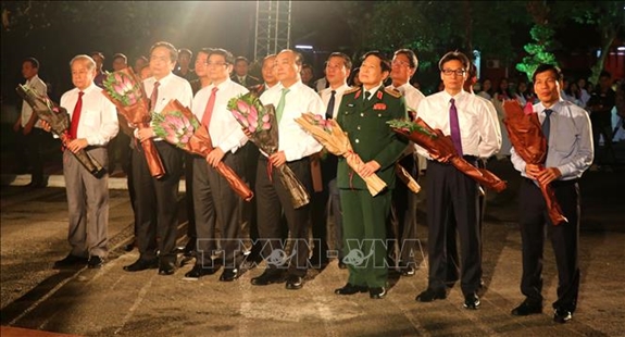 Thủ tướng Nguyễn Xuân Phúc cùng các đồng chí lãnh đạo Đảng, Nhà nước dâng hoa tại tượng đài Nguyễn Tất Thành tại Trường Quốc Học Huế. Ảnh: TTXVN.