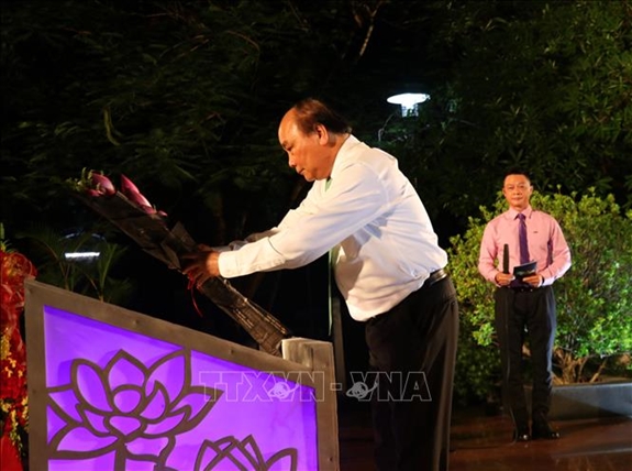 Thủ tướng Nguyễn Xuân Phúc dâng hoa tại tượng đài Nguyễn Tất Thành tại Trường Quốc Học Huế. Ảnh: TTXVN.