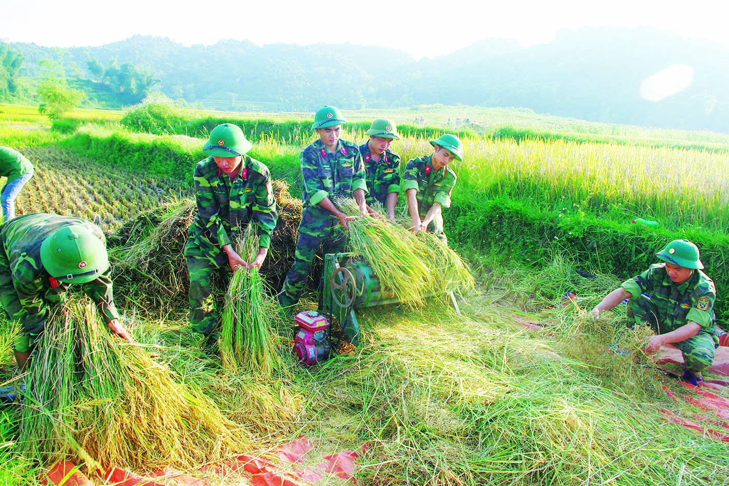 Cán bộ, chiến sĩ Kho K818 giúp nhân dân xã Hưng Vũ (Bắc Sơn, Lạng Sơn) thu hoạch lúa.
