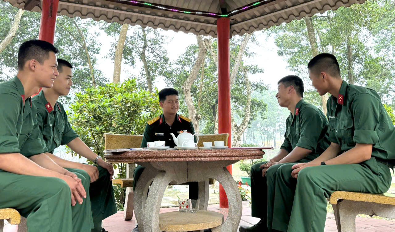 Cán bộ Đại đội 5, Tiểu đoàn 2, Trung đoàn 2 nắm bắt tâm tư bộ đội trong giờ nghỉ.