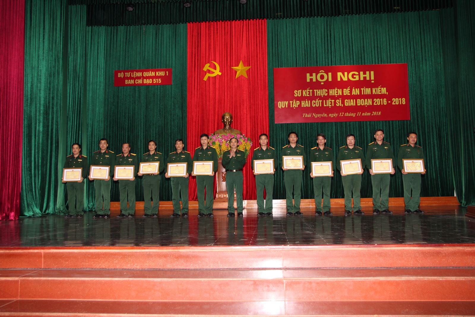 Đại tá Ngô Quang Hưng, Phó chủ nhiệm Chính trị, Phó trưởng ban chỉ đạo 515 Quân khu trao bằng khen tặng các cá nhân có thành tích trong công tác tìm kiếm, quy tập hài cốt liệt sĩ giai đoạn 2016-201. Ảnh: MẠNH QUỲNH