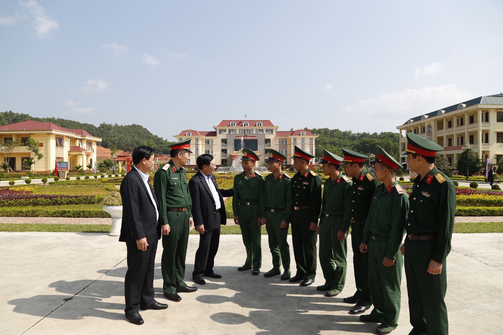 Phó thủ tướng Phạm Bình Minh trò chuyện với cán bộ, chiến sĩ sư đoàn 346. Ảnh BÙI HIỆP