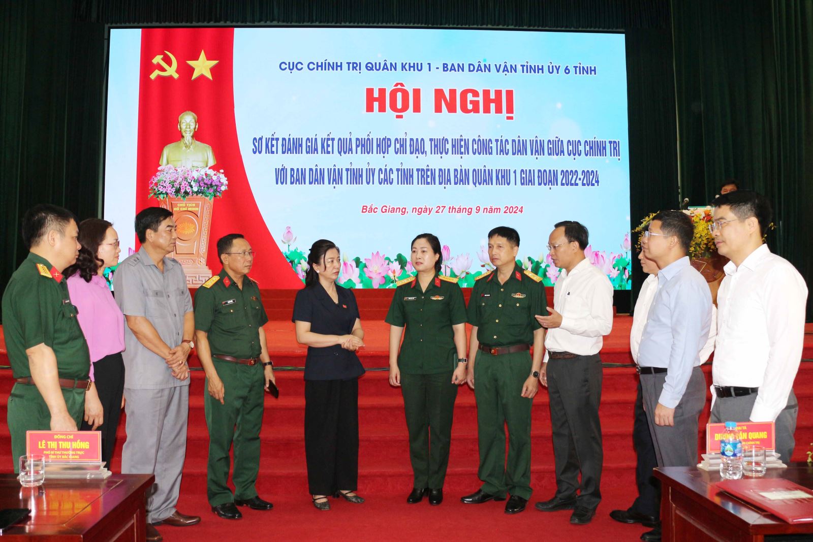 Các đại biểu tham dự có: Đồng chí Lê Thị Thu Hồng, Phó bí thư Thường trực Tỉnh ủy Bắc Giang; đồng chí Nguyễn Minh Đức, Phó vụ trưởng Vụ Dân vận, Ban Dân vận Trung ương; Đại tá Phùng Thị Phú, Phó cục trưởng Cục Dân vận; lãnh đạo Ban Dân vận Tỉnh ủy 6 tỉnh trên địa bàn và đại biểu các cơ quan, đơn vị Quân khu.