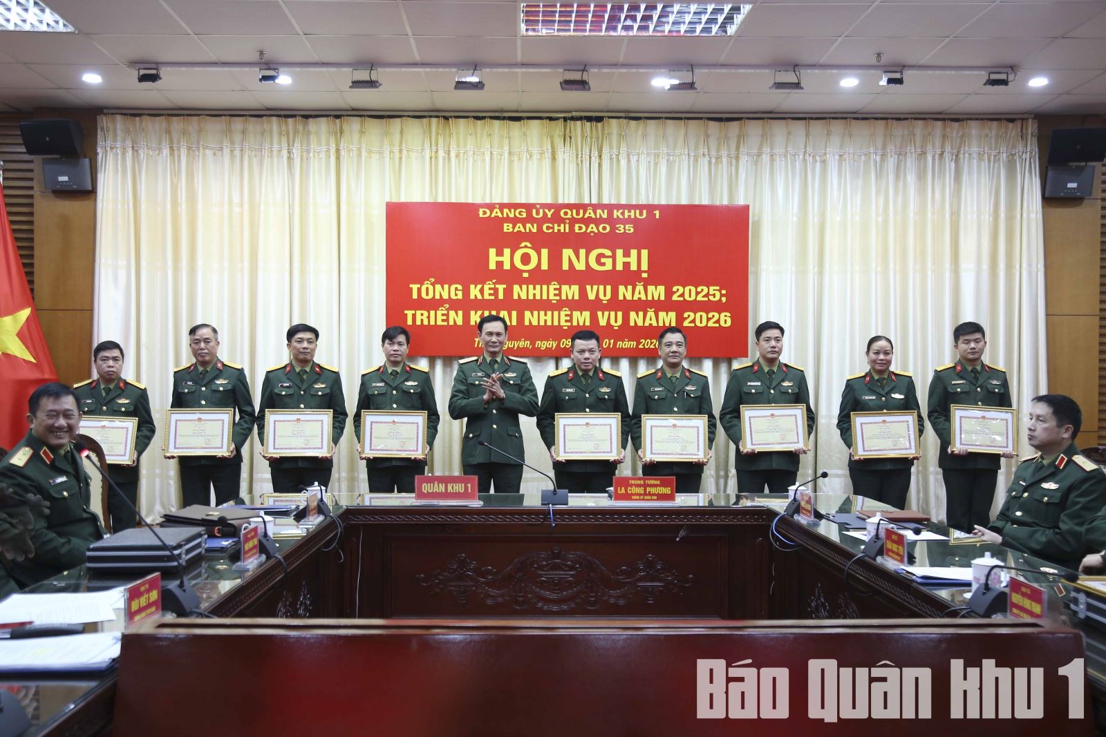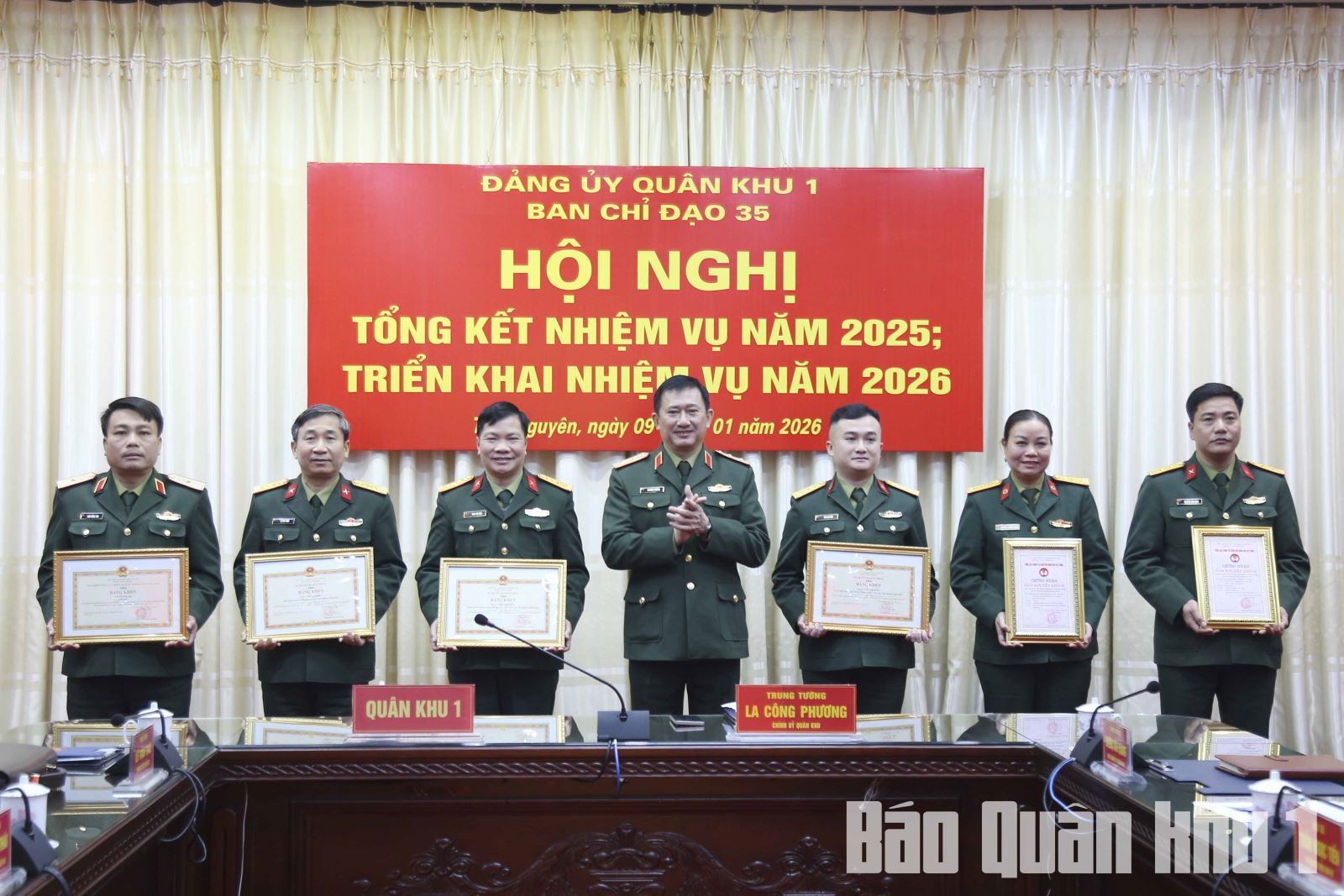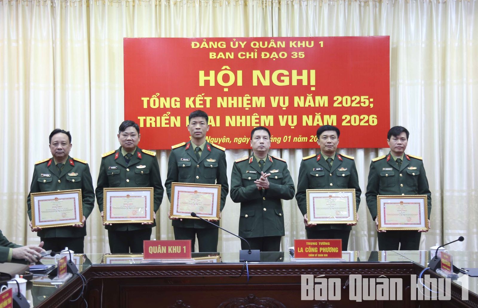 Tại hội nghị, thừa ủy quyền của Bộ trưởng Bộ Quốc phòng và Chủ nhiệm Tổng cục Chính trị, Trung tướng La Công Phương, Bí thư Đảng ủy, Chính ủy Quân khu đã trao Bằng khen của Bộ trưởng Bộ Quốc phòng, Bằng khen của Chủ nhiệm Tổng cục Chính trị và Chứng nhận của Tổng cục Chính trị cho tập thể, nhóm tác giả và tác giả đạt thành tích xuất sắc các cuộc thi chính luận về bảo vệ nền tảng tư tưởng của Đảng, đấu tranh phản bác quan điểm sai trái, thù địch trong năm 2025. Quân khu tặng Bằng khen cho 5 tập thể, 10 cá nhân vì đã có thành tích xuất sắc, tiêu biểu trong thực hiện Nghị quyết sô 35 ngày 22/10/2018 của Bộ Chính trị về tăng cường bảo vệ nền tảng tư tưởng của Đảng, đấu tranh phản bác các quan điểm sai trái, thù địch trong tình hình mới năm 2025.