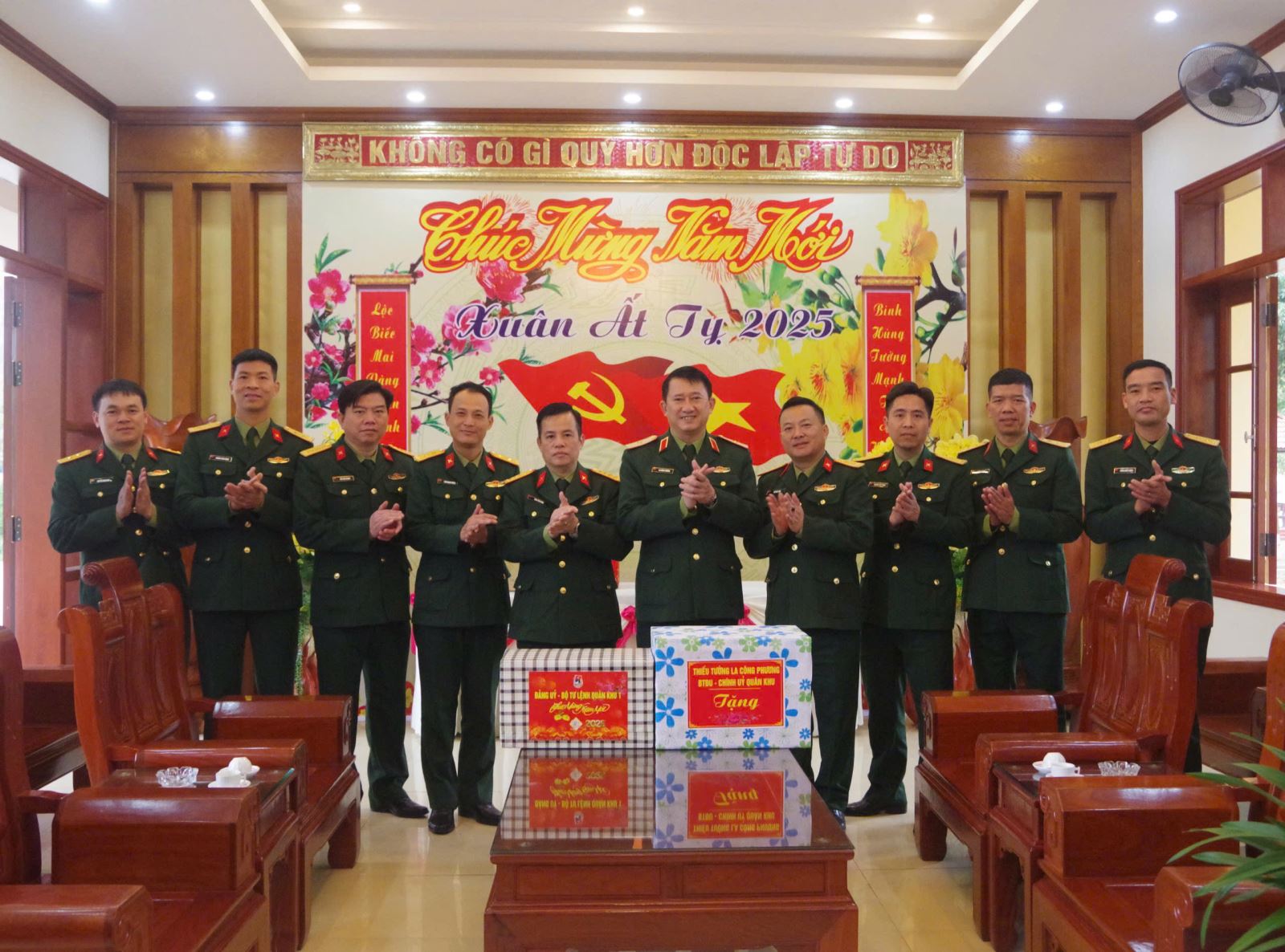 Nhân dịp chuẩn bị đón xuân mới Ất Tỵ 2025, đồng chí Chính ủy Quân khu trao quà của Bộ tư lệnh Quân khu tặng cán bộ, chiến sĩ Trung đoàn, đồng thời chúc cán bộ, chiến sĩ luôn đoàn kết, nỗ lực thi đua, phấn đấu hoàn thành xuất sắc nhiệm vụ năm 2025.